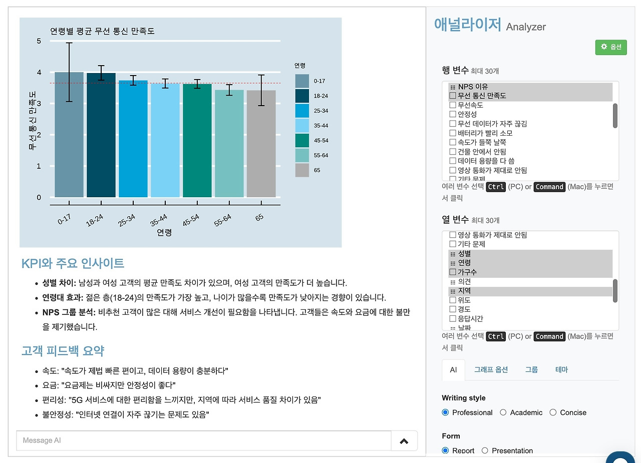 예를 들어 5G 이동통신 만족도 설문 조사 데이터를 기반으로 데이터 분석을 NumberAnalytics.com 자체 룰 기반 통계 분석을 하고 이 결과를 ChatGPT가 해석한 보고서가 위의 이미지처럼 나온다. 정확한 통계 분석 결과 표와 그래프를 바탕으로 작성했으며 이를 바탕으로 주요 결과 해석 및 그 시사점까지 제시해준다. 만족도 숫자 뿐만 아니라 불만 사항 텍스트 데이터도 자동으로 전처리 하여 단어 빈도 분석 결과 표를 바탕으로 이를 요약하여 주요 불만 사항을 요약해준다. 이렇게 하이브리드 AI를 쓰면 생성형 AI와 기존 룰 기반 통계 방법의 장점을 결합하여 정확하고 빠르게 데이터 분석을 할 수 있다.