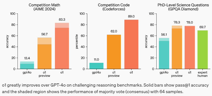 셋째, 최근에 각광받고 있는 복수 비서 모델 (Multi Agentic model)이라 불리는 방법으로 AI를 여러개를 써서 협업한다. 한번에 생성된 답을 내 놓는 것이 아니라 여러번 그 답이 맞는 지 다른 AI가 검수하거나 테스트를 진행해 틀린 답이 나오면 다시 일을 시킨다. 최근 OpenAI에서 발표한 ChatGPT 4o1이 대표적인 복수 비서 모델이다. 유명한 예로 strawberry 단어에서 r이 몇개인지 물으면 기존에 틀린 답을 내놓았는데, ChatGPT 4o1은 첫번째 비서가 내놓은 답을 두번째 비서가 테스트한다. 틀린 답을 내놓으면 다시 일을 시킨다. 그래서 테스트를 통과해야 답을 내놓는다. 그래서 아래 그래프에서 보듯이 수학, 코딩, 박사 수준의 과학 문제에서 탁월한 성능 향상을 이루어 냈다.
