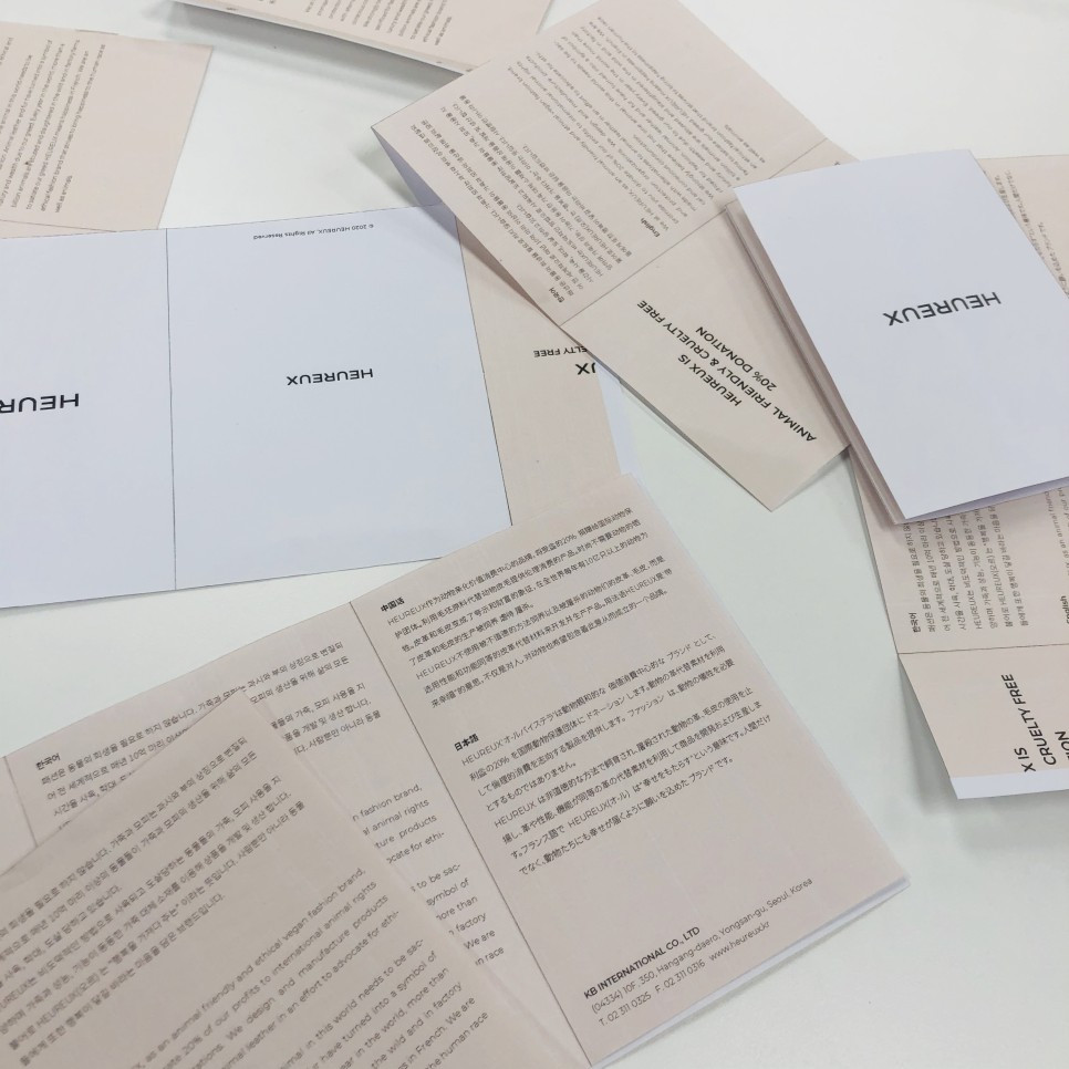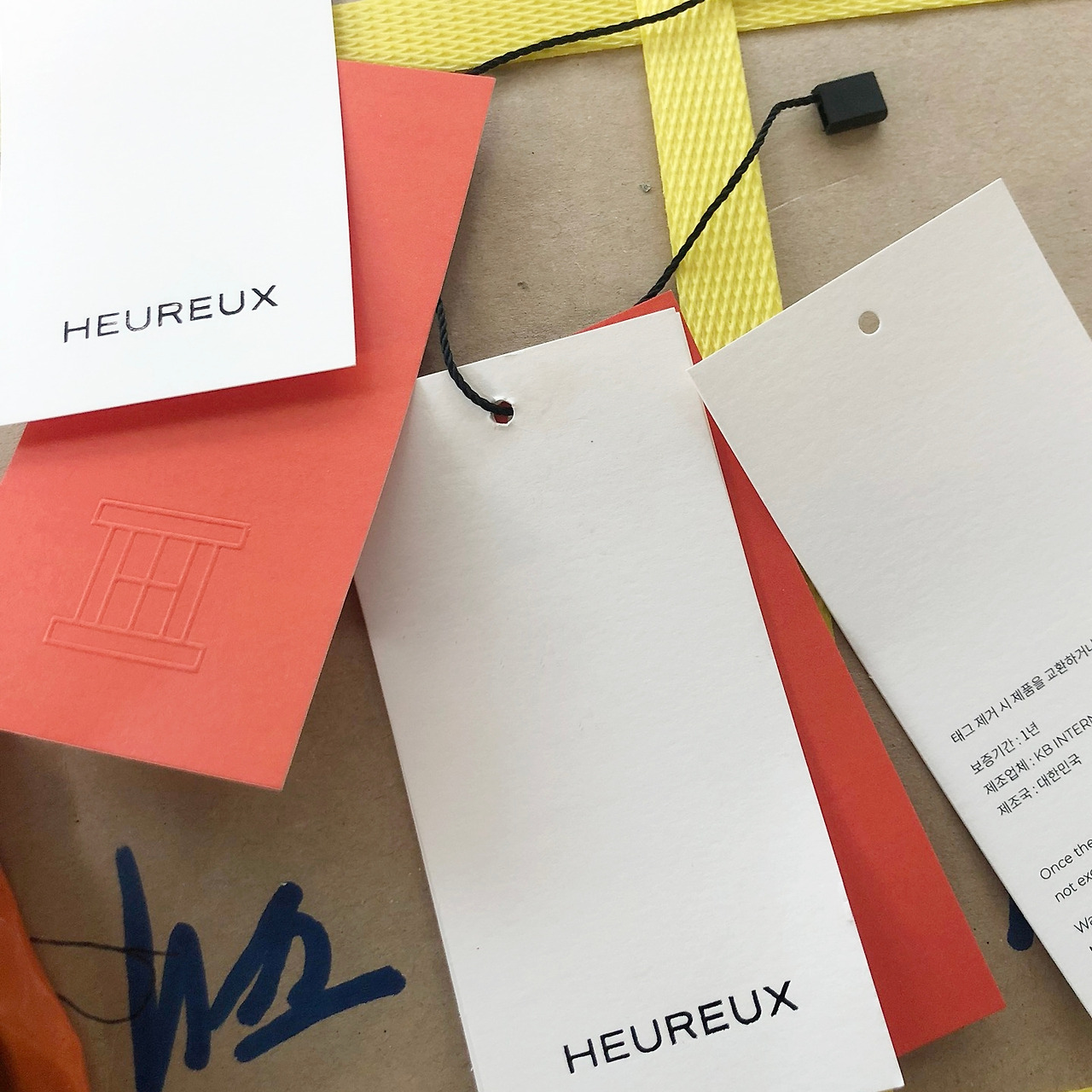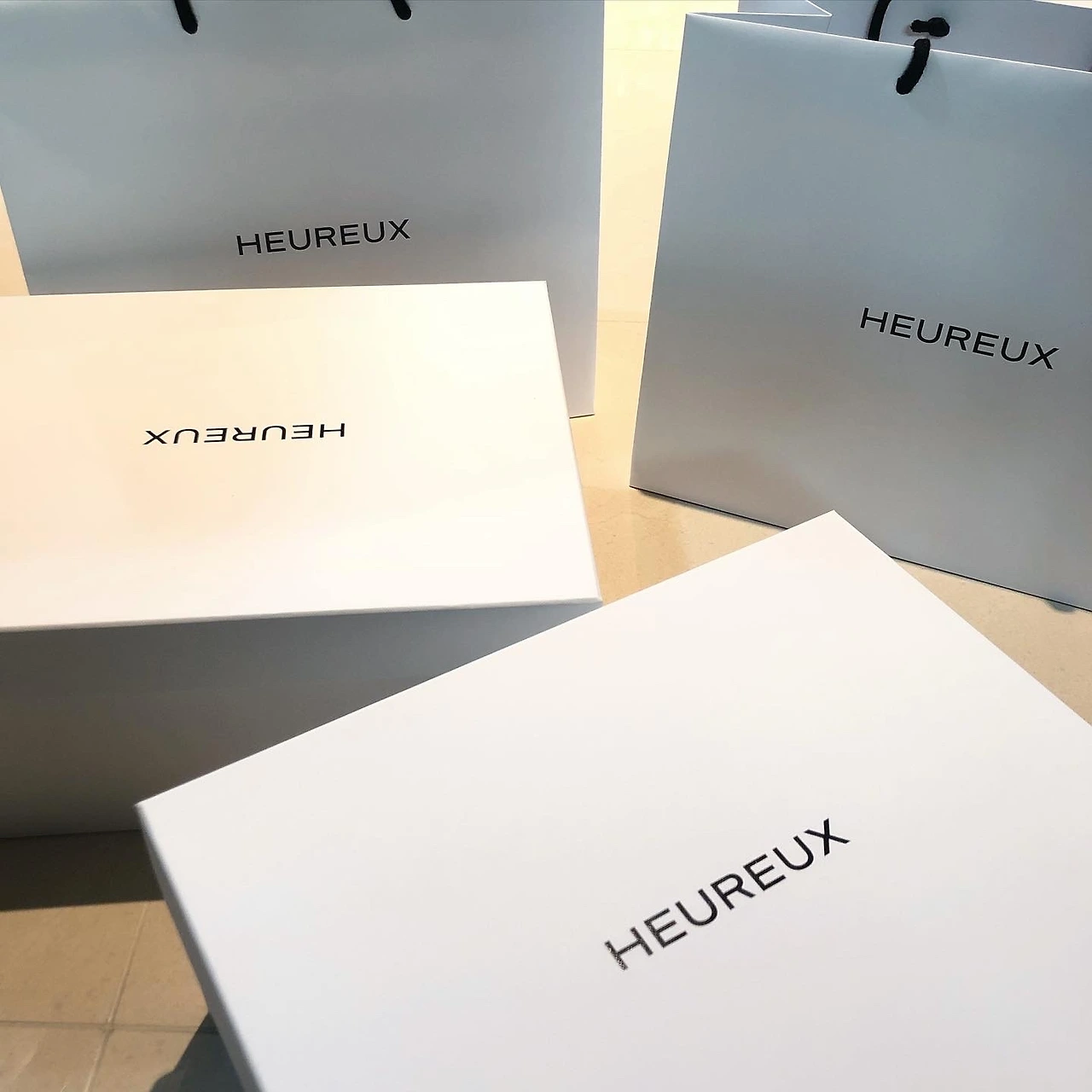 처음 HEUREUX에서 제안해주신 응용디자인은 박스, 쇼핑백, 택 까지 제작을 원하셨습니다. 하지만 실제 제품을 구매하게 되는 소비자의 입장에서 한 번 더 생각해보았습니다. 모든 여성들은 명품을 좋아합니다. 저도 그렇고요. 그래서 HEUREUX의 가방을 구매하고 받는 과정에서 어떻게 하면 소비자가 더 기분 좋은 소비경험을 느낄 수 있을지 고민했습니다. 명품을 구매했을 때의 경험을 떠올려 더스트백, 품질보증서, 정품 증명서 보증서 봉투까지 제작을 제안하여 디자인하게 되었습니다. 가방의 크기에 맞게 박스 사이즈, 쇼핑백 사이즈를 점검하고 해당 사이즈에 맞게 디자인합니다. 택이나 보증서는 1:1 사이즈로 출력해보고 가방에 어울리는 사이즈를 고민해보고, 글자크기나 오타교정 등 샘플링하며 작업합니다. 편안한 아름다움이라는 브랜드 모토에 맞게 종이 재질은 광이 없는 두꺼운 고급지를 사용했으며. 후가공 역시 금박이나 은박의 후가공보다는 형압을 사용해 브랜드 모토에 맞게 응용디자인을 제작했습니다.