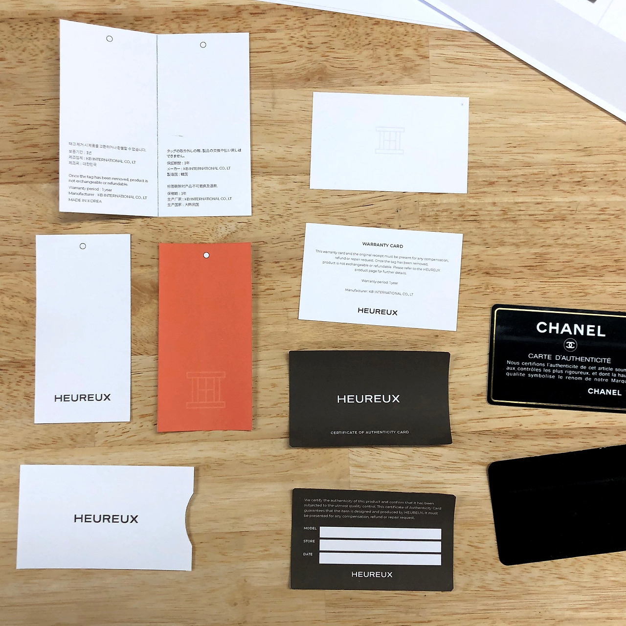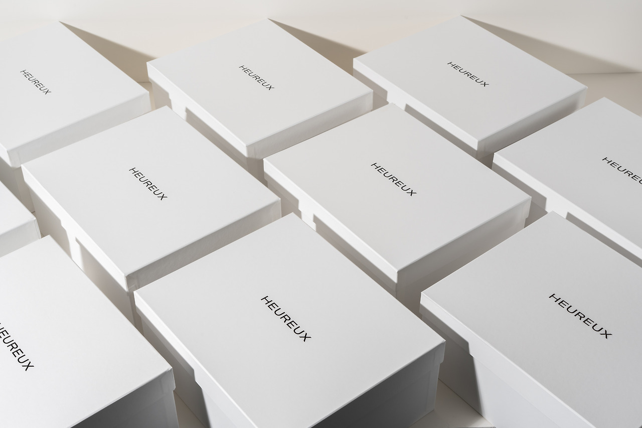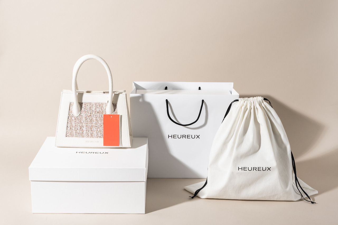 처음 HEUREUX에서 제안해주신 응용디자인은 박스, 쇼핑백, 택 까지 제작을 원하셨습니다. 하지만 실제 제품을 구매하게 되는 소비자의 입장에서 한 번 더 생각해보았습니다. 모든 여성들은 명품을 좋아합니다. 저도 그렇고요. 그래서 HEUREUX의 가방을 구매하고 받는 과정에서 어떻게 하면 소비자가 더 기분 좋은 소비경험을 느낄 수 있을지 고민했습니다. 명품을 구매했을 때의 경험을 떠올려 더스트백, 품질보증서, 정품 증명서 보증서 봉투까지 제작을 제안하여 디자인하게 되었습니다. 가방의 크기에 맞게 박스 사이즈, 쇼핑백 사이즈를 점검하고 해당 사이즈에 맞게 디자인합니다. 택이나 보증서는 1:1 사이즈로 출력해보고 가방에 어울리는 사이즈를 고민해보고, 글자크기나 오타교정 등 샘플링하며 작업합니다. 편안한 아름다움이라는 브랜드 모토에 맞게 종이 재질은 광이 없는 두꺼운 고급지를 사용했으며. 후가공 역시 금박이나 은박의 후가공보다는 형압을 사용해 브랜드 모토에 맞게 응용디자인을 제작했습니다.
