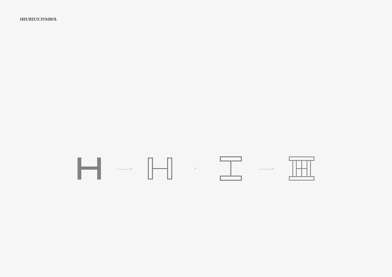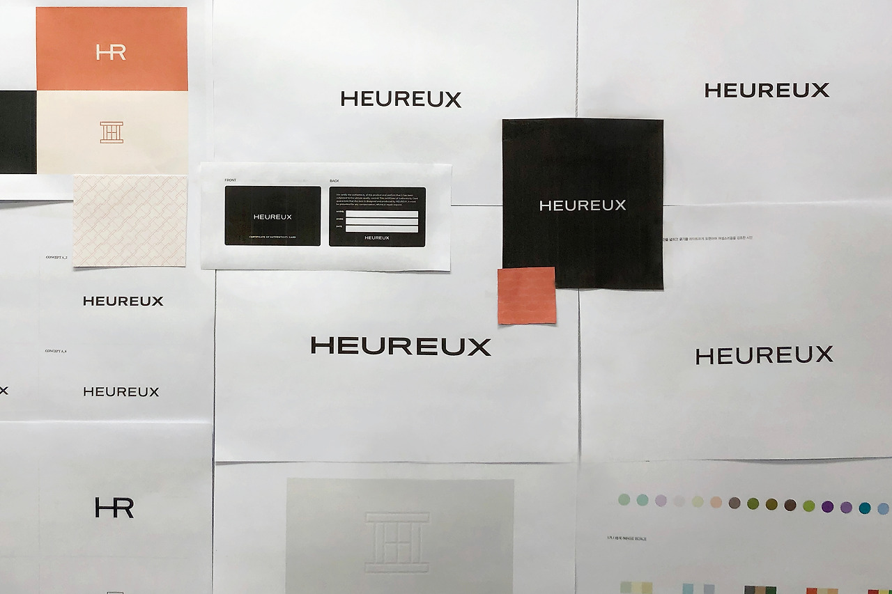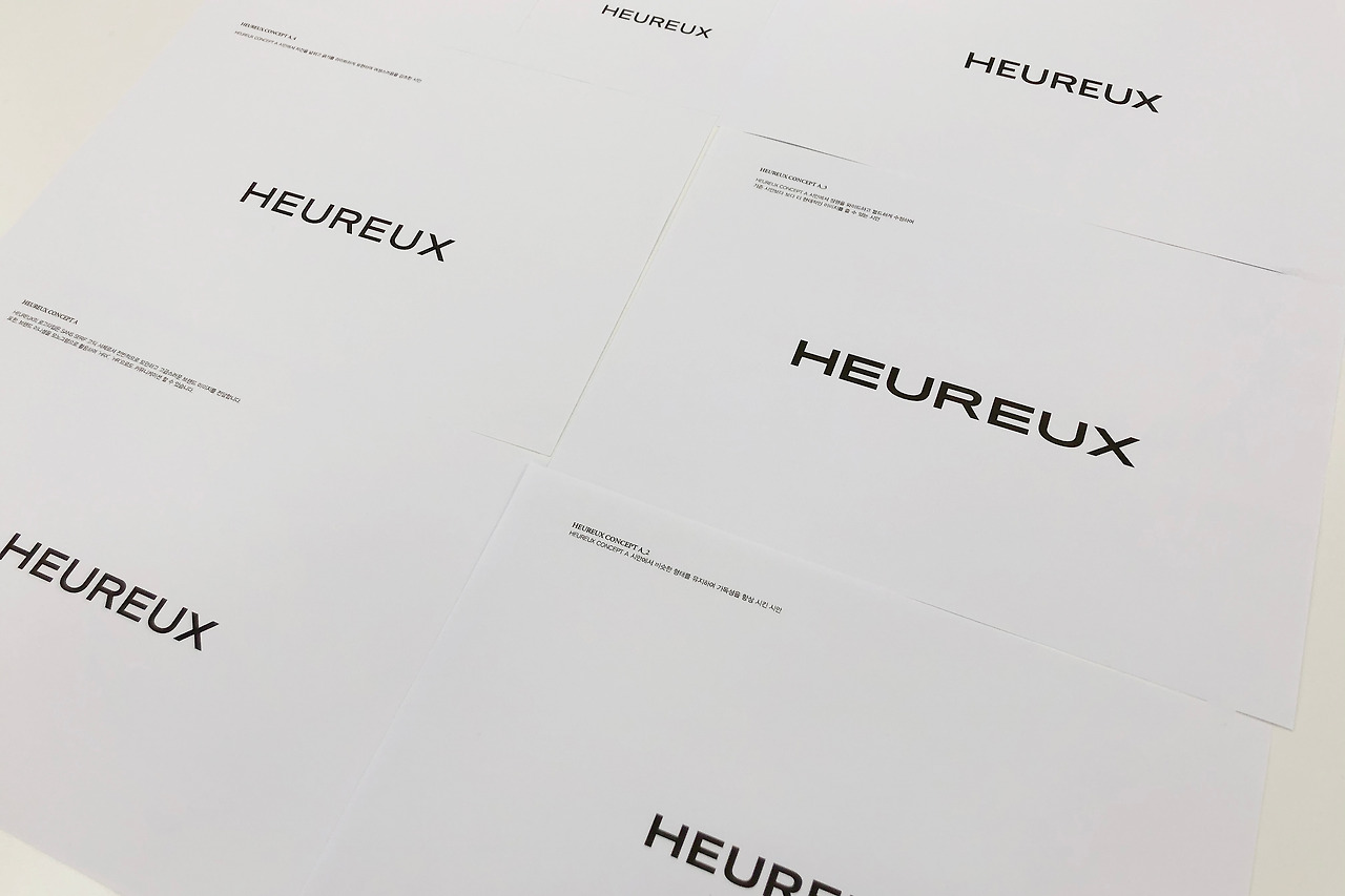 로고타입은 안정적이고 편안한 이미지를 위해 날씬한 형태보다는 가로 폭을 넓게 디자인했으며, 넓은 가로 폭 속에서 여성스러운 이미지를 줄 수 있도록 굵기와 자간 폭 등을 조절해가며 편안하고 아름다움을 추구하는 HEUREUX의 최종 로고타입의 형태를 완성시켰습니다.