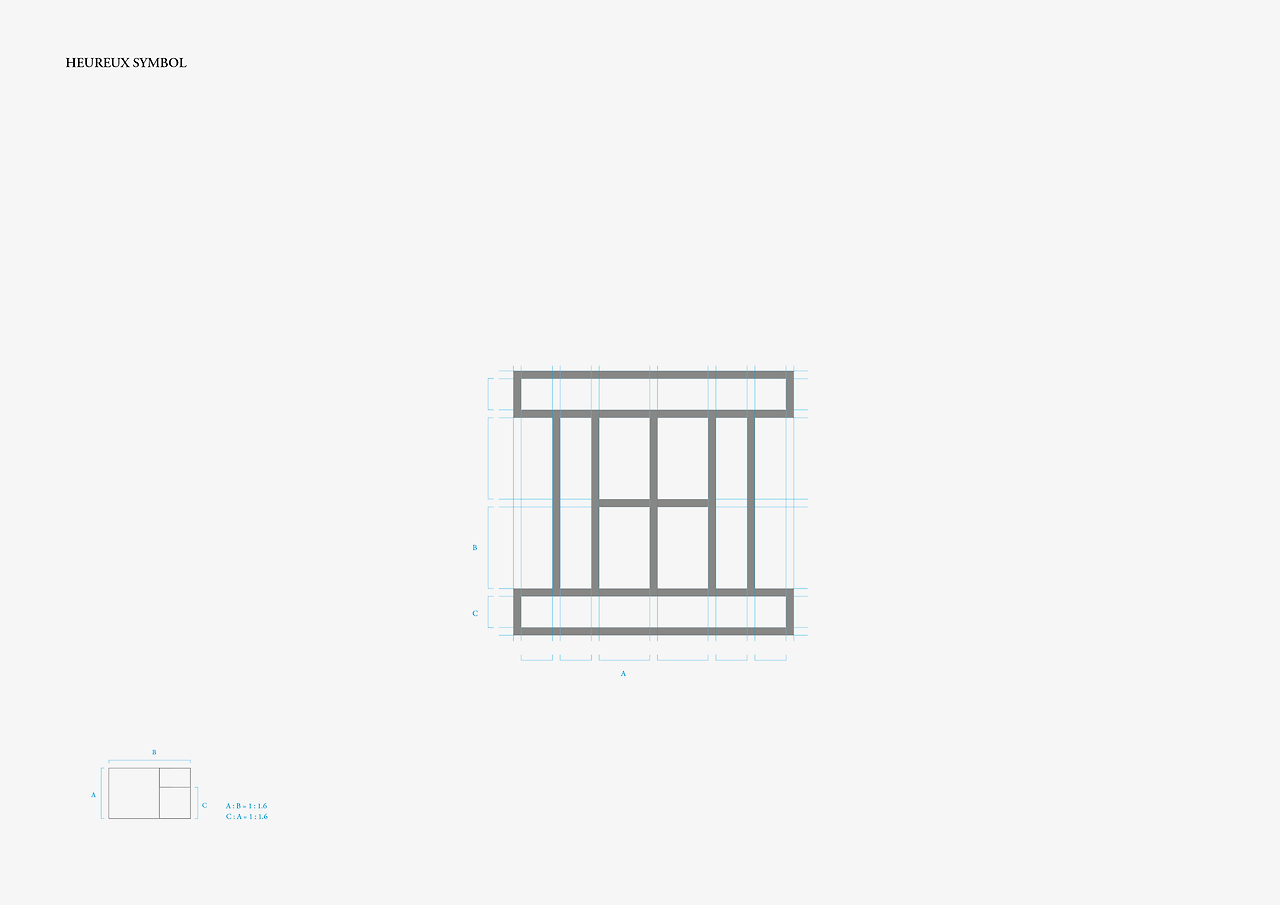마인드맵을 통해 편안한 아름다움을 줄 수 있는 키워드로 '균형(balance)', '비율(ratio)'이라는 키워드를 도출했습니다. HEUREUX의 핵심가치인 '미'와 '편안함'을 표현하기 위해 시각적으로 균형감 있는 심벌을 만들기 위해 고민했고 HEUREUX의 이니셜 H를 1:1.6의 비율로 배치하여 심벌을 디자인했습니다. 1:1.6의 비율은 정사각의 비율보다 사람들의 눈에 편안하고 안정적인 형태의 비율로 인지되는 비율입니다. 우리가 사용하는 신용카드 역시 1:1.58의 비율로 1:1.6의 비율과 상당히 가까운 비율을 사용하고 있습니다. 또한 현재는 과학적으로 근거가 없다고 밝혀진 바가 있지만 그리스 수학자 피타고라스에 의한 이론인 황금비율로도 불리는 비율입니다.