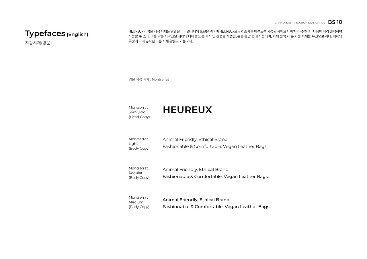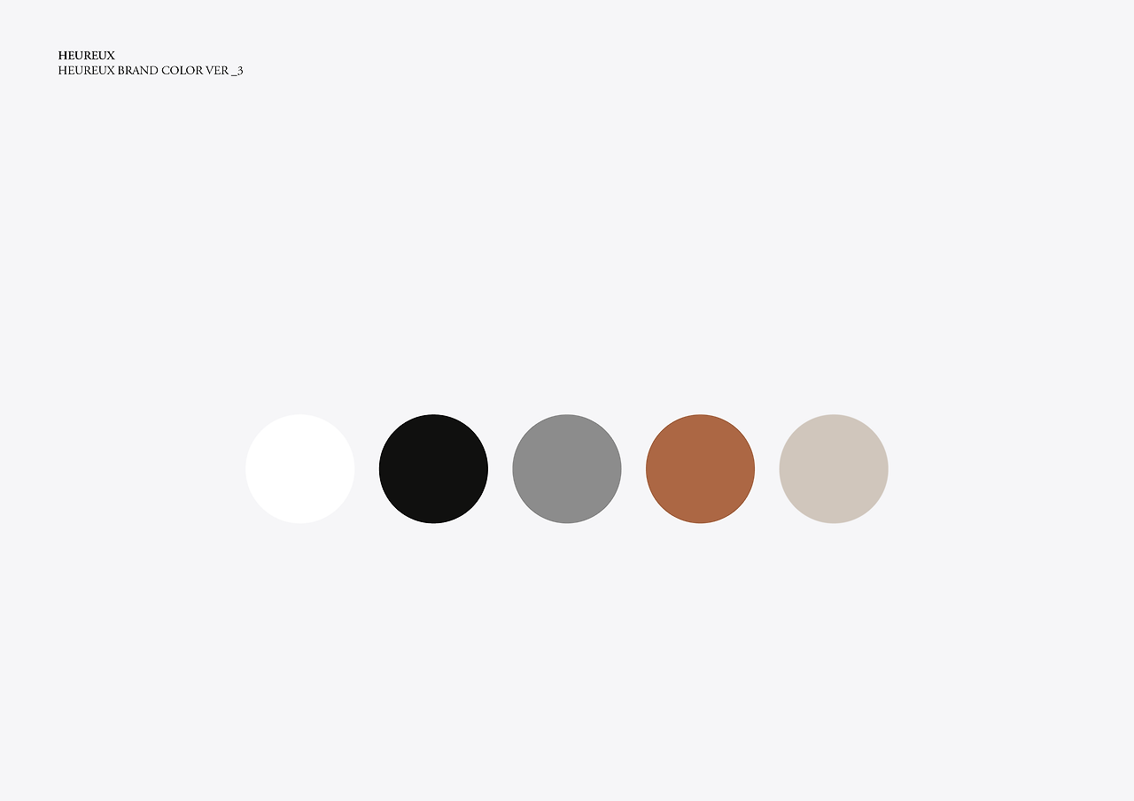 HEUREUX는 프랑스어로 기쁨, 행운, 행복하다라는 의미를 가지고 있습니다. HEUREUX의 주 타겟층은 20-30대의 젊은 여성이고, 화려하고 반짝거리는 여성스러움이 아닌 편안함 속에서 미를 추구하는 브랜드입니다. 또한 동물 친화적인 브랜드로 사람과 동물 모두에게 행복이 닿길 바라는 마음을 담은 브랜드입니다. 이러한 특징에 가장 어울리는 로고타입은 산세리프 고딕의 형태가 적합하다고 판단했습니다.