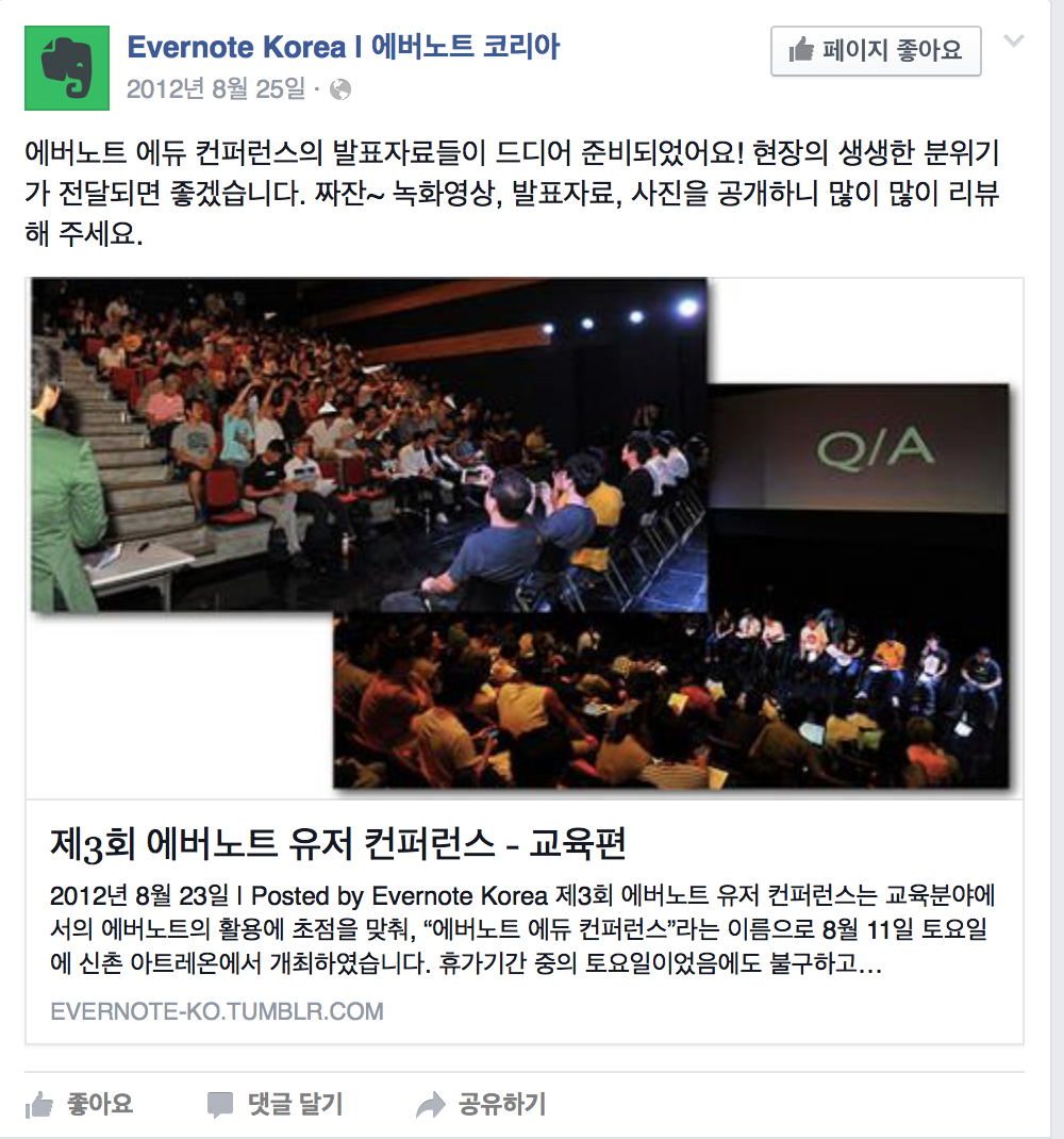 에버노트의 진가를 알게 된 것은 2012년 8월, 에버노트 에듀 컨퍼런스에서 였다. 거기서 홍순성 씨를 비롯하여 박종필 선생님, 박승훈 선생님, 이호진 선생님, 안태일 선생님의 발표를 들었다. 정말 신세계였다.
