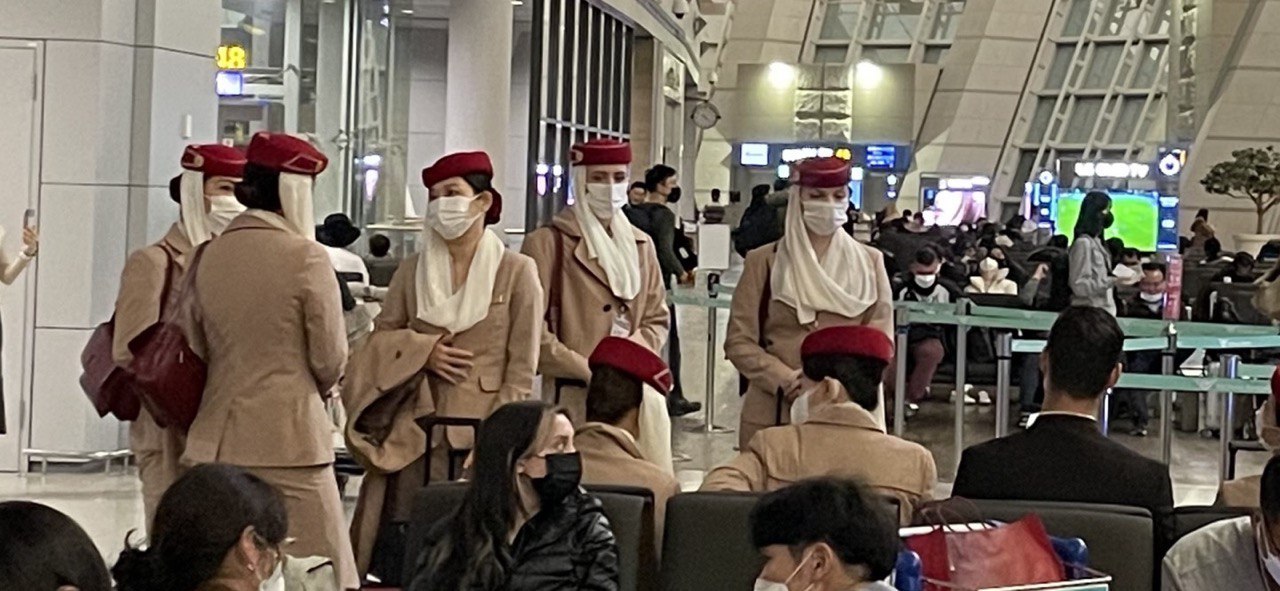 코로나로 인천-리스본 직항이 없어져버려 두바이 경유 편을 이용했다. 두바이항공 게이트 앞의 승무원.