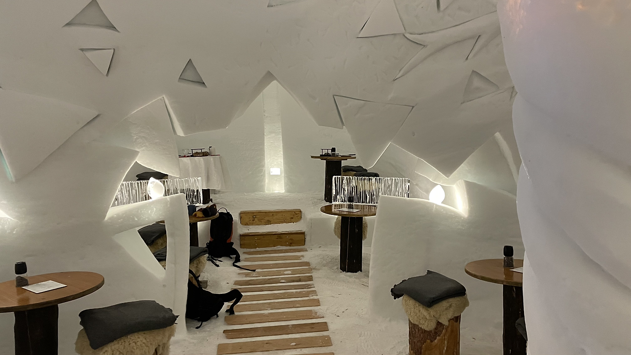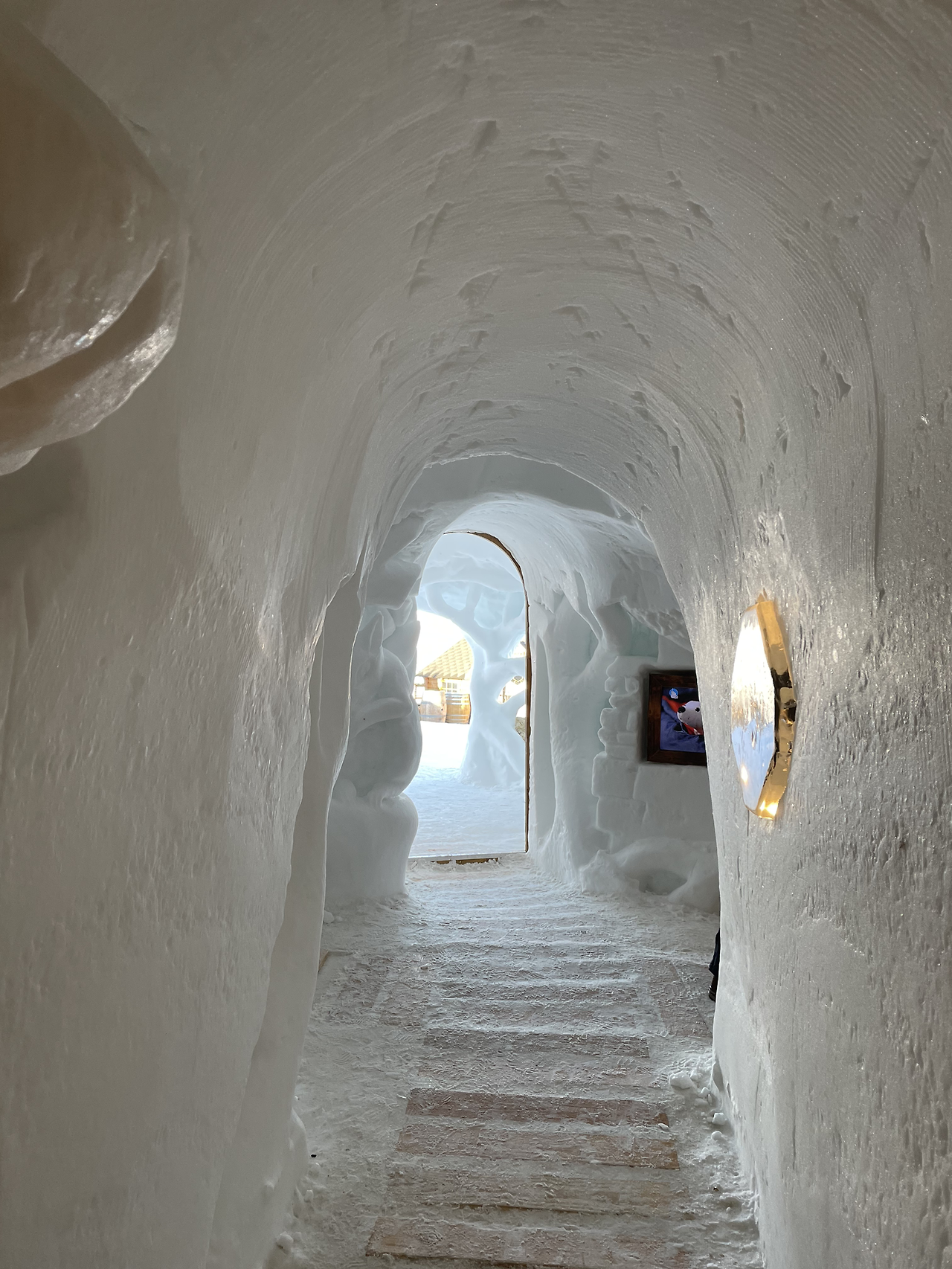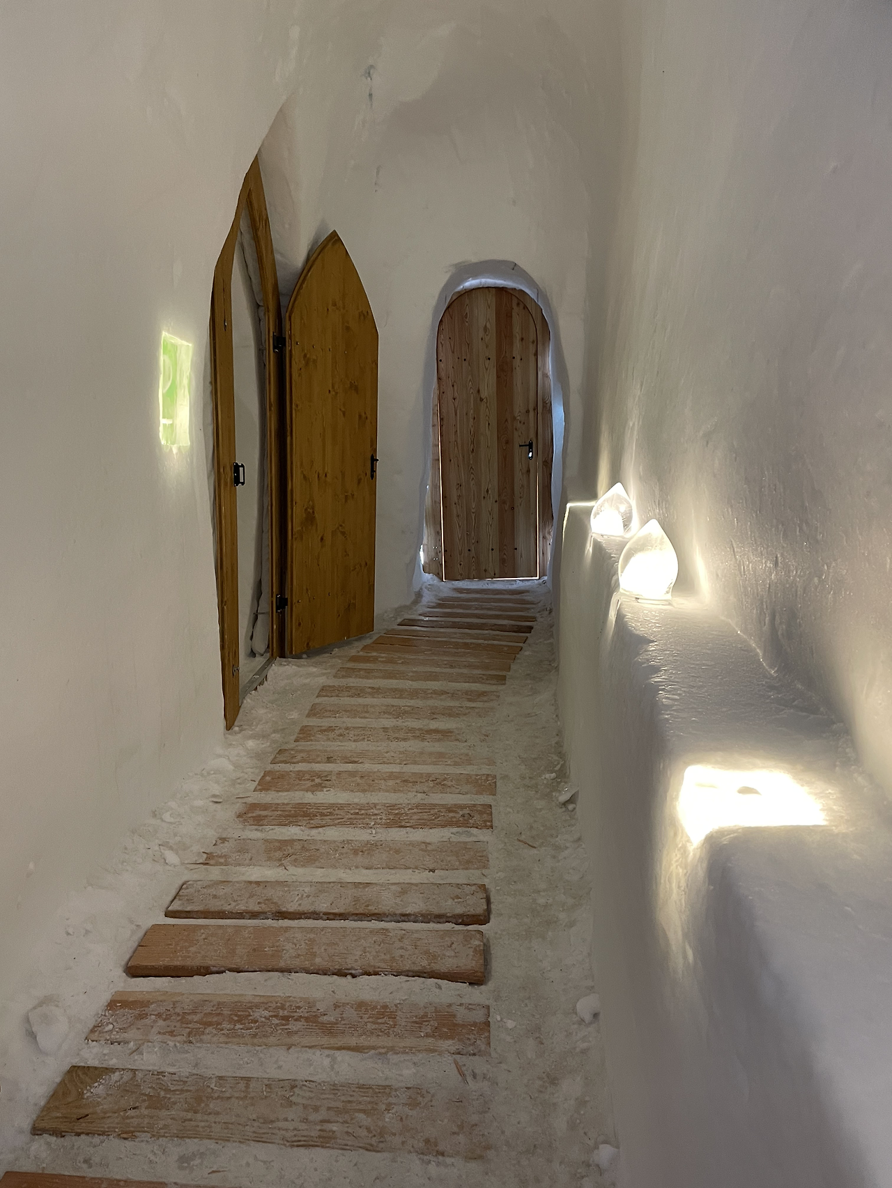 웰컴 드링크로 나온 따듯한 뱅쇼가 혈관 깊숙이 전달되며 몸을 이완시키지만 마터호른의 냉기를 감당하기엔 무리다. 흘러내린 코가 인중에 얼어붙는 느낌이다. 미리 주문해 둔 퐁듀와 치즈가 저녁 식탁에 차려진다. 얼음 테이블이다! 저녁식사를 한 후 이글루 구경에 나선다. 이글루 내부는 얼음과 눈으로 화려하게 장식되어 있다. 여름이면 녹아 없어질 것을 알면서 조각에 이리 정성을 쏟다니, 조각가의 진심과 순수에 감탄한다. 아니 어쩌면 그 피할 수 없는 사라짐에 진하게 감동한다. 문제는 온기라고는 없는 실내다. 침대로 마련된 매트리스 위에는 동물 가죽이 깔려 있고 그 위에 침낭이 놓여 있다. 작은 온열 매트를 준비해 갔으나 콘센트라고는 벽면 어디에도 없다. 냉골에서 잠을 잘 수 있을까, 초저녁부터 나는 밤을 보낼 일로 걱정이 태산이다.