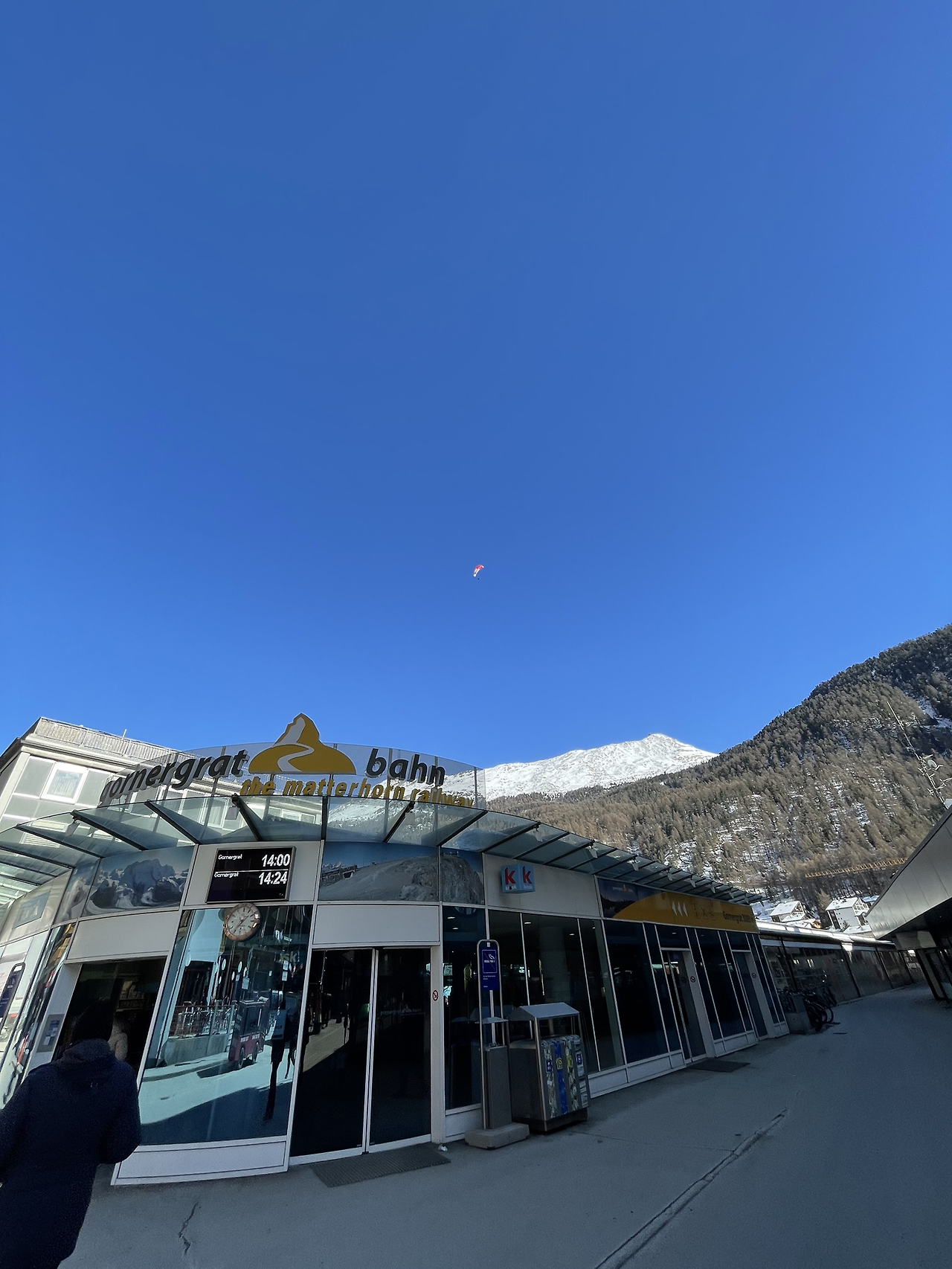 산악기차 고 너 그라트 반 매표소(왼쪽)와 체르마트 마을(오른쪽). 목조건물 너머로 마터호른 봉우리가 보인다.