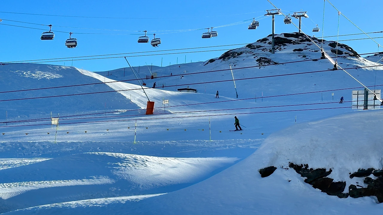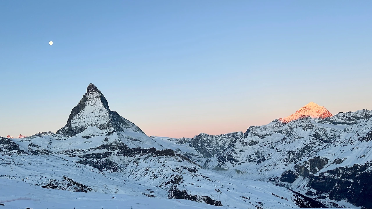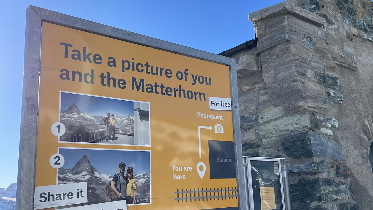 광고에 삽입된 마터호른과 스키 리프트. 이른 아침부터 스키어들이 산을 수놓는다.