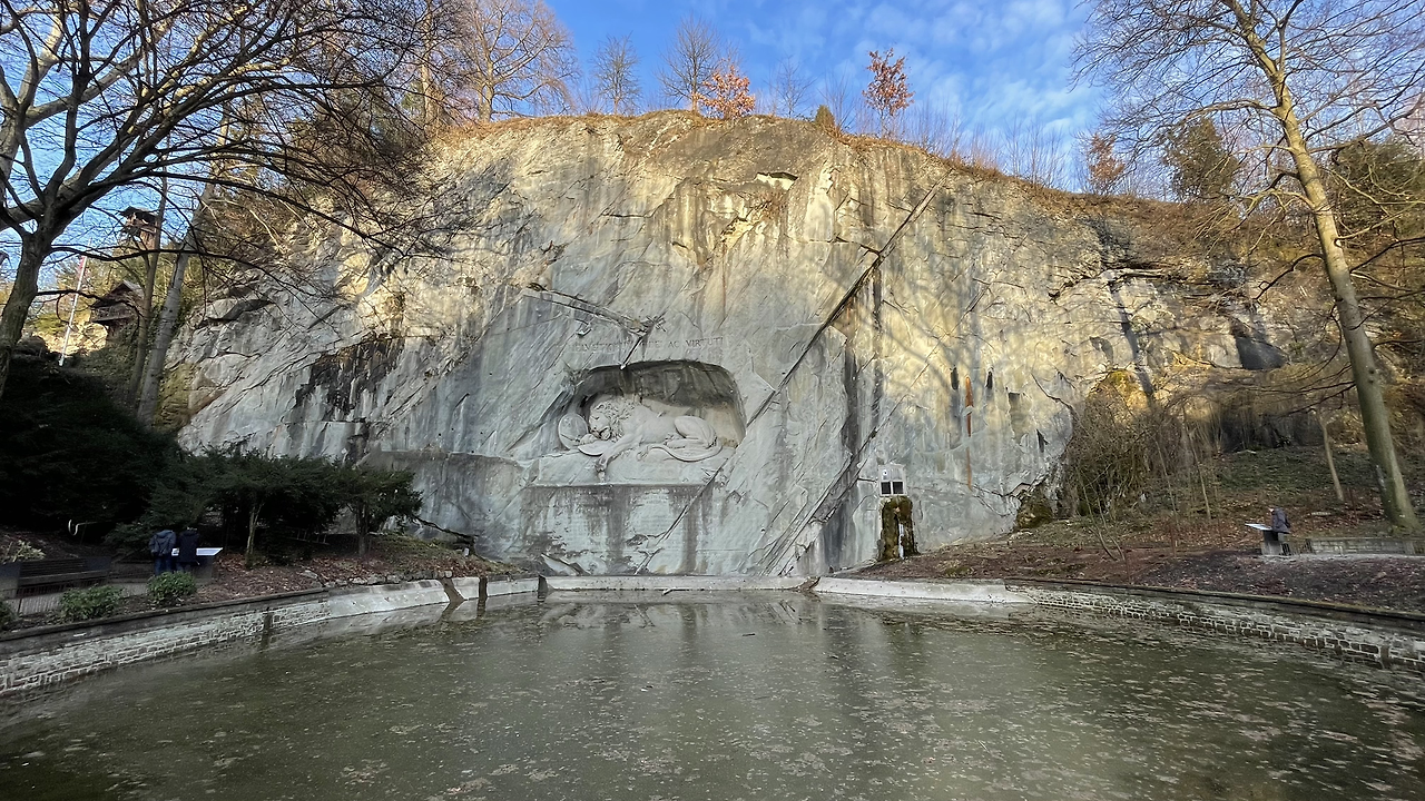 빈사의 사자상을 찾아간다. 그동안 사진으로만 보던 빈사의 사자상은 절벽에 조각되어 있다. 조각상 앞은 연못을 꾸며 놓았다.