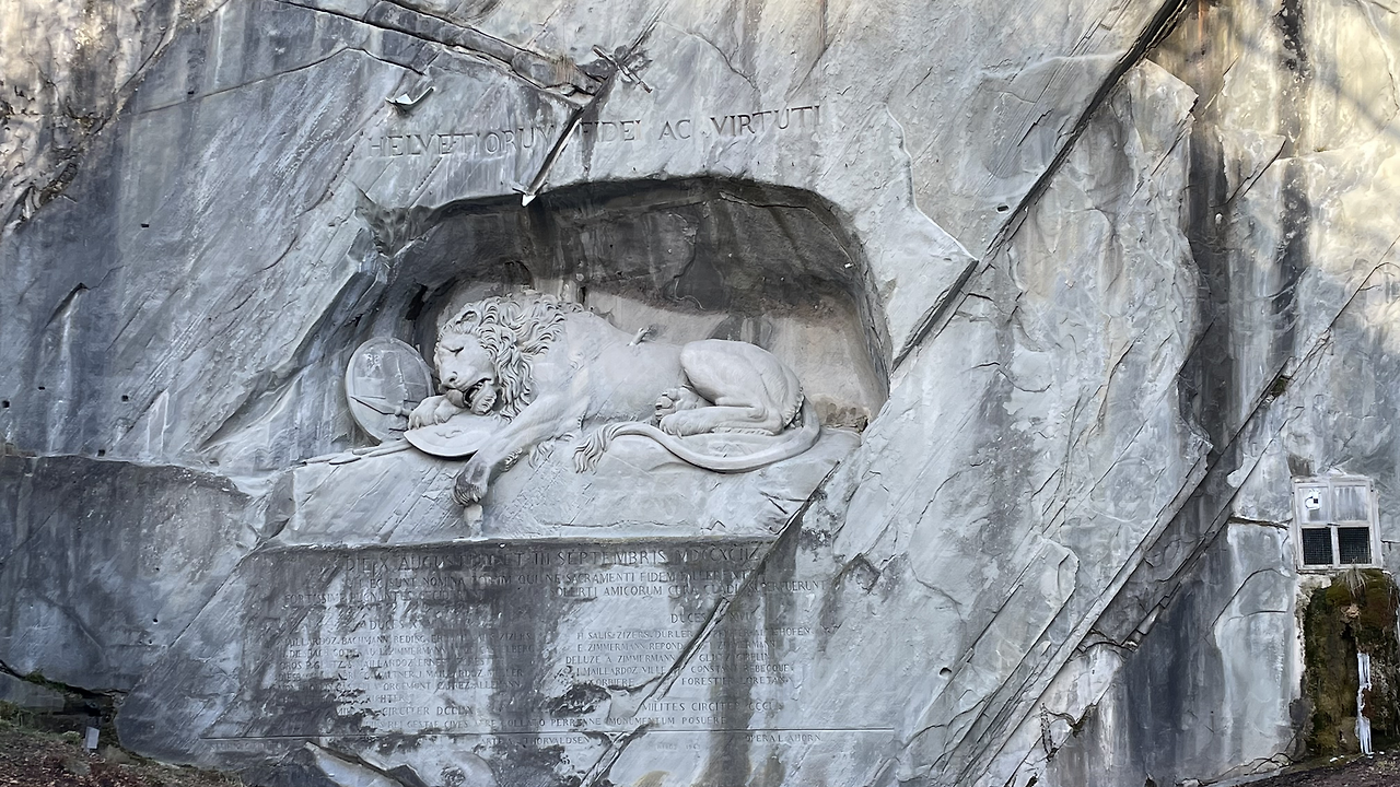 조각의 내용을 보자. 이 조각은 과거, 가난 때문에 프랑스혁명 진압에 동원되었던 스위스 장병을 위로하는 위령비다. 절벽 안쪽의 비석은 가로 10미터, 높이 6미터. 창에 찔려 죽어가는 사자는 프랑스 왕실을 상징하는 백합 문양 방패를 덮고 있고, 그 옆에는 스위스 국장이 새겨진 방패가 있다. 조각상 아래에는 장교들의 이름을 새겨 두었다. 전사자 760명, 생존자 350명이라는 숫자도 있다.
