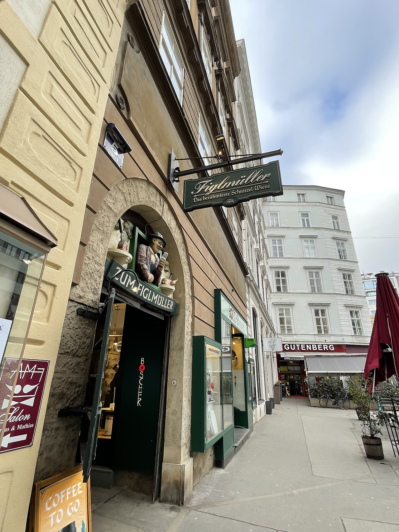 시계방향으로 몸을 돌리자 피그뮐러 식당 간판이 보인다. 1905년 문을 열었으니 100년이 넘은 식당이다. 슈니첼 전문이라 하고 한국인들에게도 빈 맛집으로 알려져 있다 해서 호기심이 있었으나 튀긴 음식은 이제 그만이다! 집 떠난 지 한 달이 넘어가니 식사는 점점 한식만 찾게 된다. 싼 일식집 김밥이 슈니첼보다 맛난 게 내 입맛이다. 슈니첼은 고기망치로 두들겨 얇게 편 고기에 튀김옷을 입혀 내는 것이다. 내게는 돈가스의 다른 버전 정도. 미안하지만 가게만 구경하고 나온다.