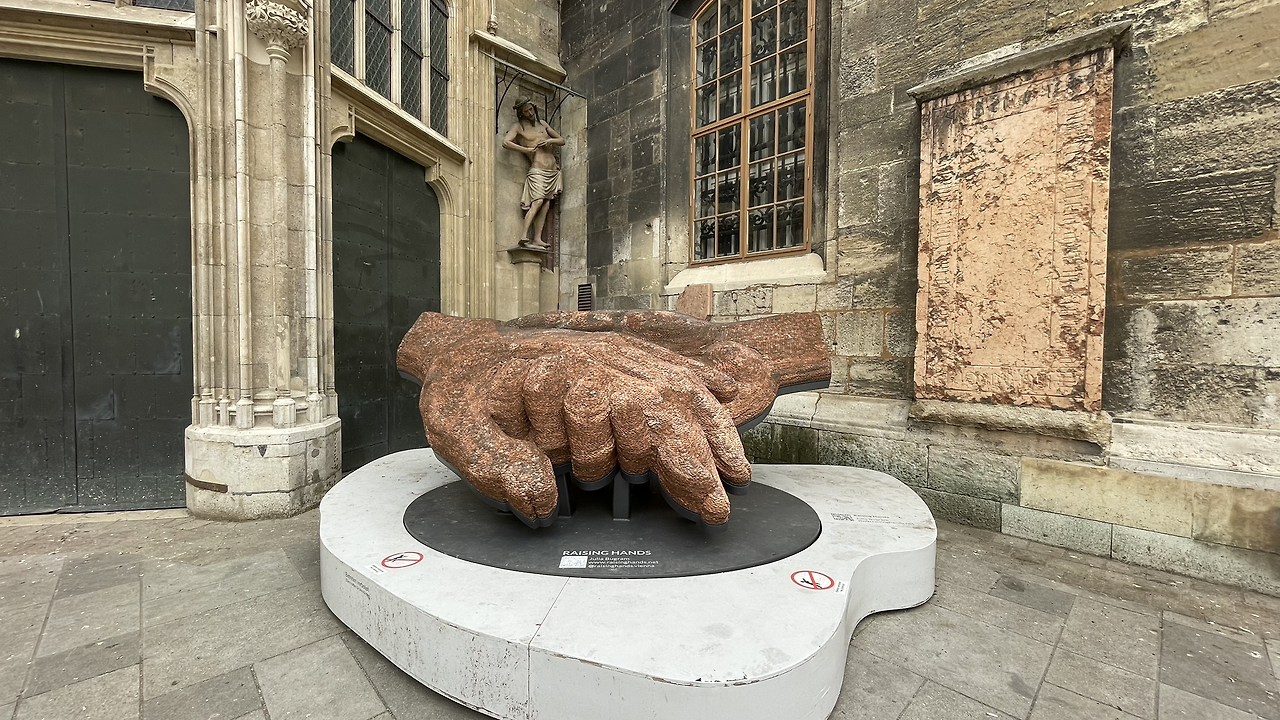 슈테판 성당 뒤쪽 구석에 있는 조형물. 동전을 쌓아 올려 만들었다. Raising Hands.