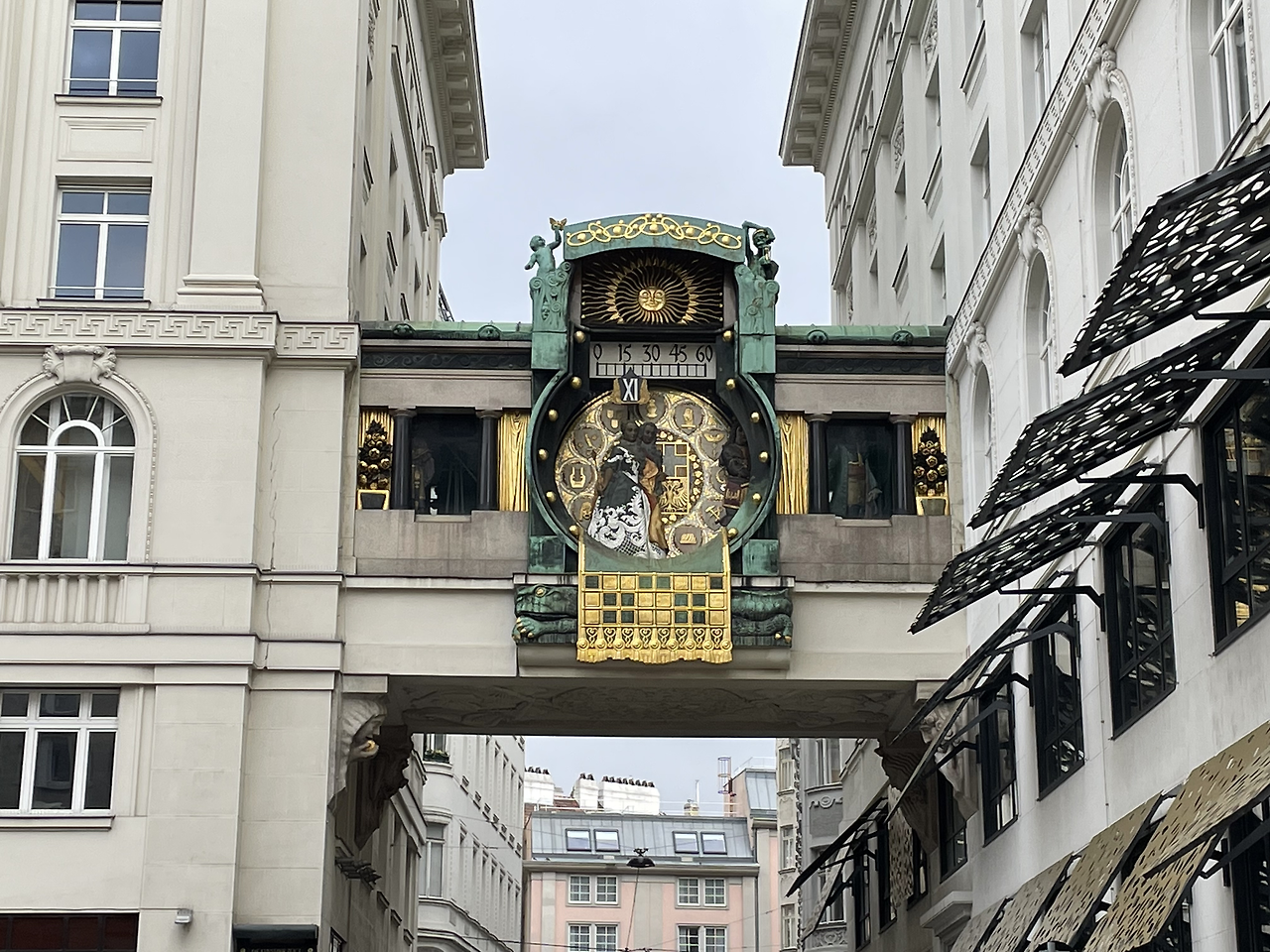 앙커 보험회사의 두 건물 사이를 잇는 구름다리에 걸린 시계, 앙커우어 인형시계다. 가만히 보고 서 있으니 인형이 조금씩 움직인다. 매 시 정각에 오스트리아의 중요한 인물 인형이 이렇게 나타난다. 시계 중앙 양 옆을 자세히 보면 대기 중인 인형들이 보인다. 12시에는 열 두 사람이 모두 나타난다고 하는데 내가 간 시간은 11시 15분이 조금 넘었다. 나는 기다리지 못하고 자리를 뜬다. 아르누보 양식의 디자인을 감상할 수 있는 시계다.