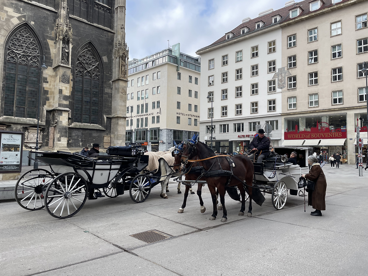 슈테판 성당 앞 광장의 마차들. 한 할머니가 마차삯을 흥정하고 있다.