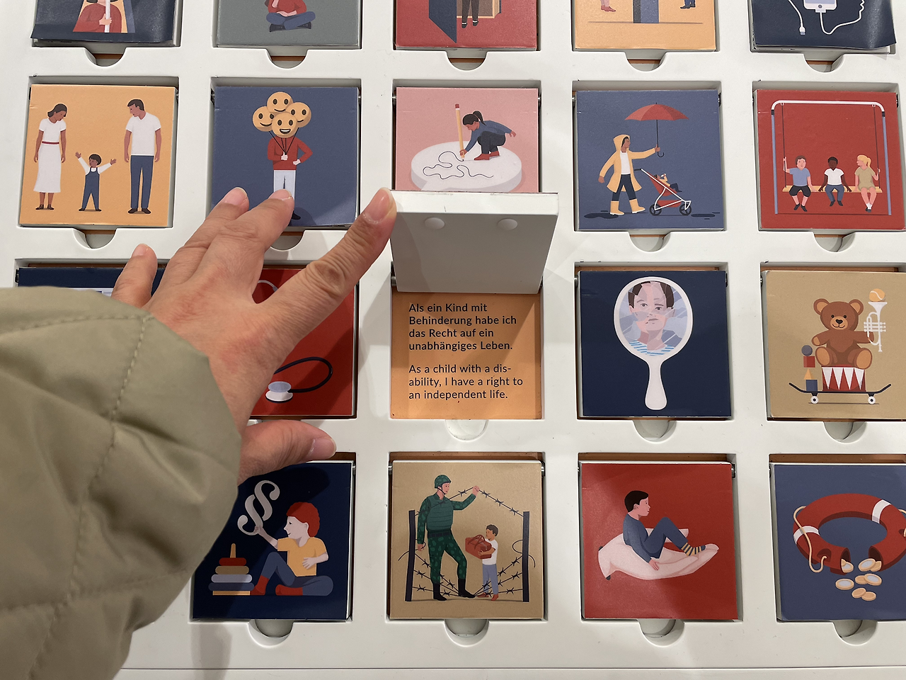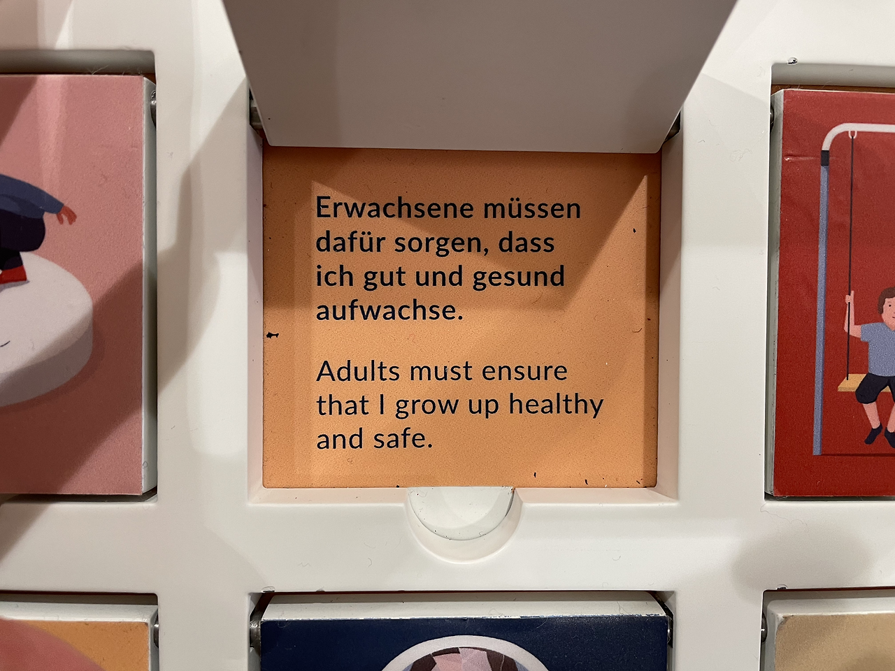 빈 국회의사당 로비의 조형물. 사람들이 전시물을 만지며 교감할 수 있다. 상자 중 하나를 열어본다. 어른들은 반드시 어린이가 안전하고 건강하게 자랄 수 있도록 돌봐야 한다고 적혀 있다.