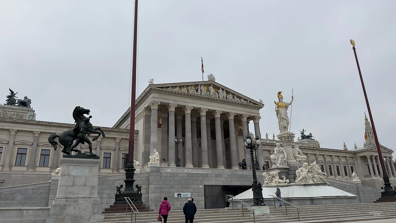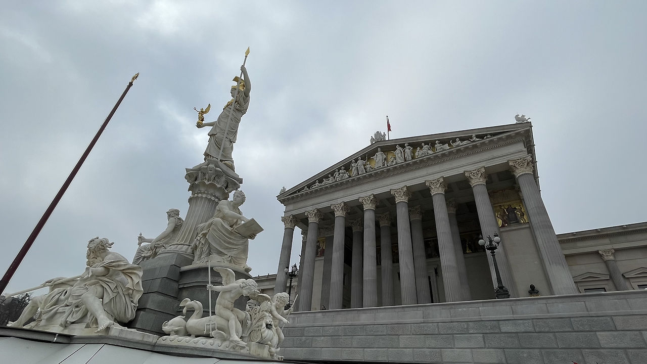 고대 그리스의 민주주의를 염원하는 마음으로 파르테논 신전을 본떠 만들었다고 한다. 의사당 정면에는 여신상 분수가 있다. 여신상 아래 4개의 토수구가 있는데 이는 과거 호프부르크 왕국의 영토였던 땅의 경계를 의미한다. 정면은 빈 도나우강, 인스브루크의 인강 Inn river, 함부르크 엘베강, 프라하의 볼타 강까지를 뜻한다.
