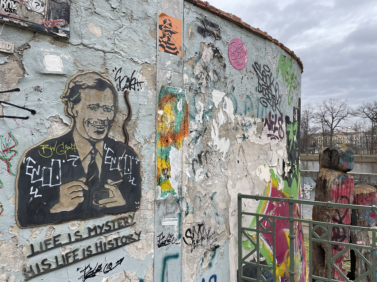 블타바강가 후미진 곳의 낙서들. 바로 옆 강물에는 백조가 놀고 있다. 레넌 벽을 찾아가다 잠시 강가로 내려왔더니 낙서 벽이 있다. 눈에 띄는 낙서들도 많다. 그중, 체코의 국부인 바츨라프 하벨 대통령 그림과 함께 Life is Mystery, his life is History! 가 돌출낙서로 눈길을 사로잡는다. 프라하를 돌아다니는 동안 곳곳에서 하벨과 마주쳤다. 프라하 시민이 얼마나 그를 사랑하는지 알게 하는 낙서다.