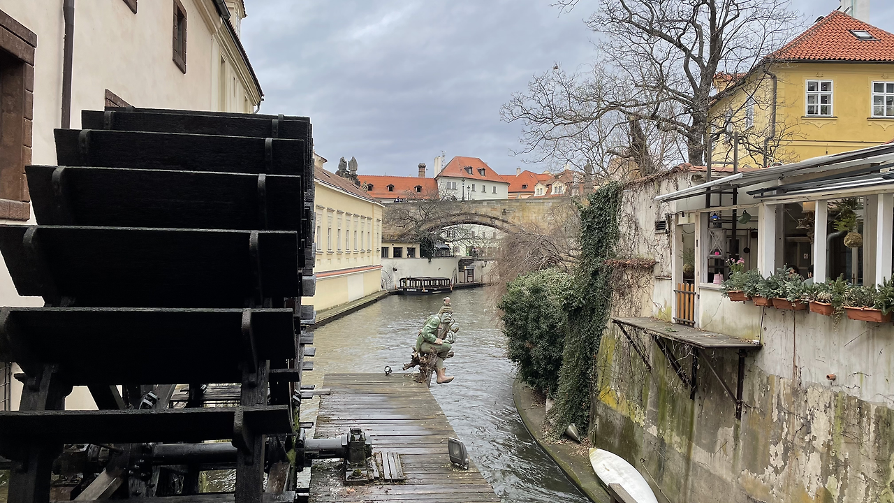 레넌 벽 가는 길이다. 뒷편에서 다룰 생각이지만 프라하에는 재미있는 동상들이 많다. 풍차가 돌아가는 작은 강물 위, 강물에 뛰어 들 것같은 조각상이 있다.