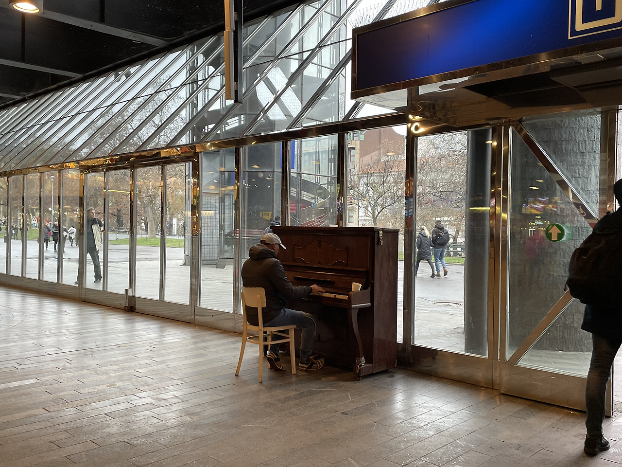 프라하 중앙역 출입구 앞의 피아노와 피아노 치는 남자. 그는 클래식 곡들을 쉬지 않고 연주 중이다. 사슬처럼 피아노를 묶고 있는 열쇠는 그가 연주하는 음악과 슬픈 대조를 이룬다.