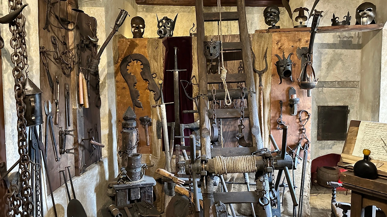 황금소로에 전시된 고문 도구들. 역겹고 슬픈 그림자까지 담을 수 있다면 공산주의 통제사회 진면목을 더 잘 보여줄 수 있을 텐데, 그 느낌은 내 살갗에만 남아 있다.