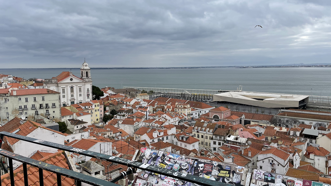 다시 28번 트램을 타고 내린다. 포르타스 두 솔 전망대. 리스본 수호성인 성 빈센트 동상 뒤로 리스본 구시가인 알파마 지구 붉은 지붕들과 바다인 듯한 테주 강이 시원하게 펼쳐진다.
