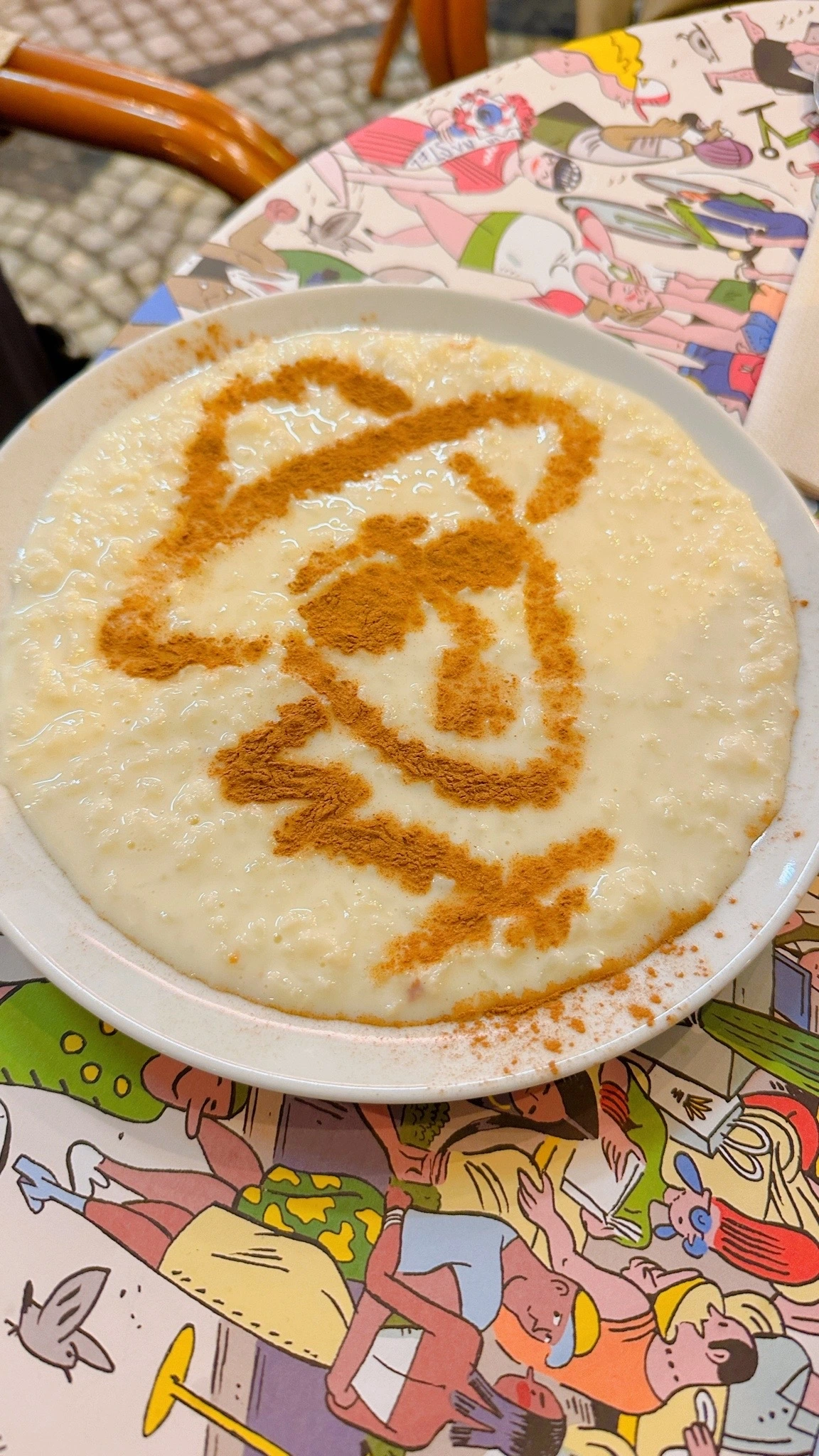 카페 브라질레이리아, 페르난도 페소아가 자주 앉던 자리에 그의 동상이 앉아 있다. 그의 시선이 닿은 곳이 어딜까 상상하며 가게 앞 거리를 둘러본다. 카레 브라질레이리아에는 시그니처 메뉴가 있다. 페르난도 페소아 얼굴이 그려진 디저트 '스위트 라이스'다. 여기서 저녁을 먹고 호텔로 돌아온다.