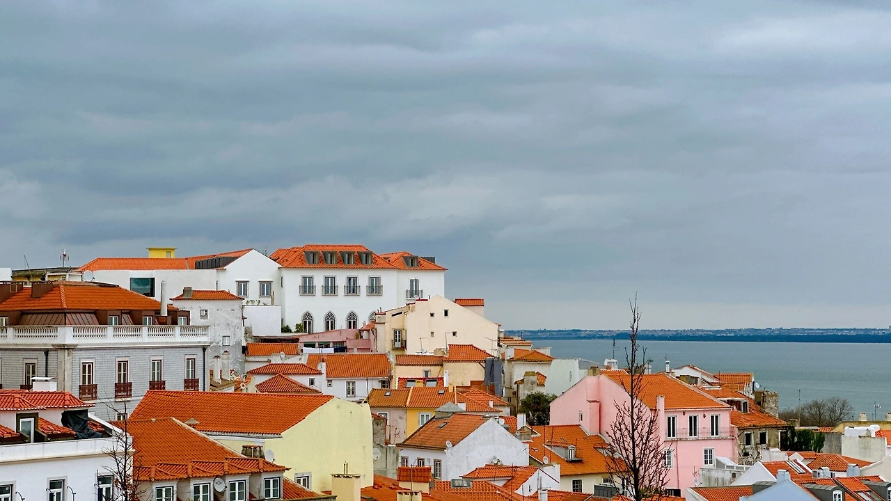 포르타스 두 솔 전망대에서 내려다본 알파마 지구 전경. 리스본 구시가지다. 알파마 지구 앞으로 테주 강이 흐른다.