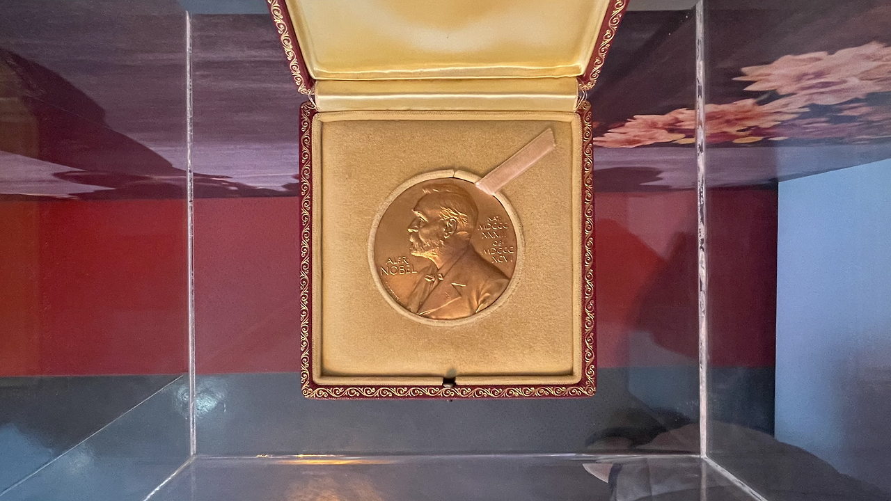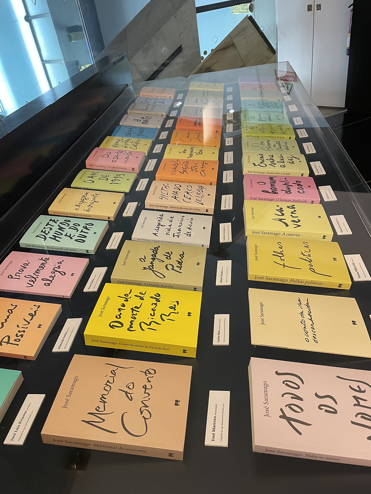 유리장 속에 보관되어 있는 노벨상 메달과 사라마고의 책들.