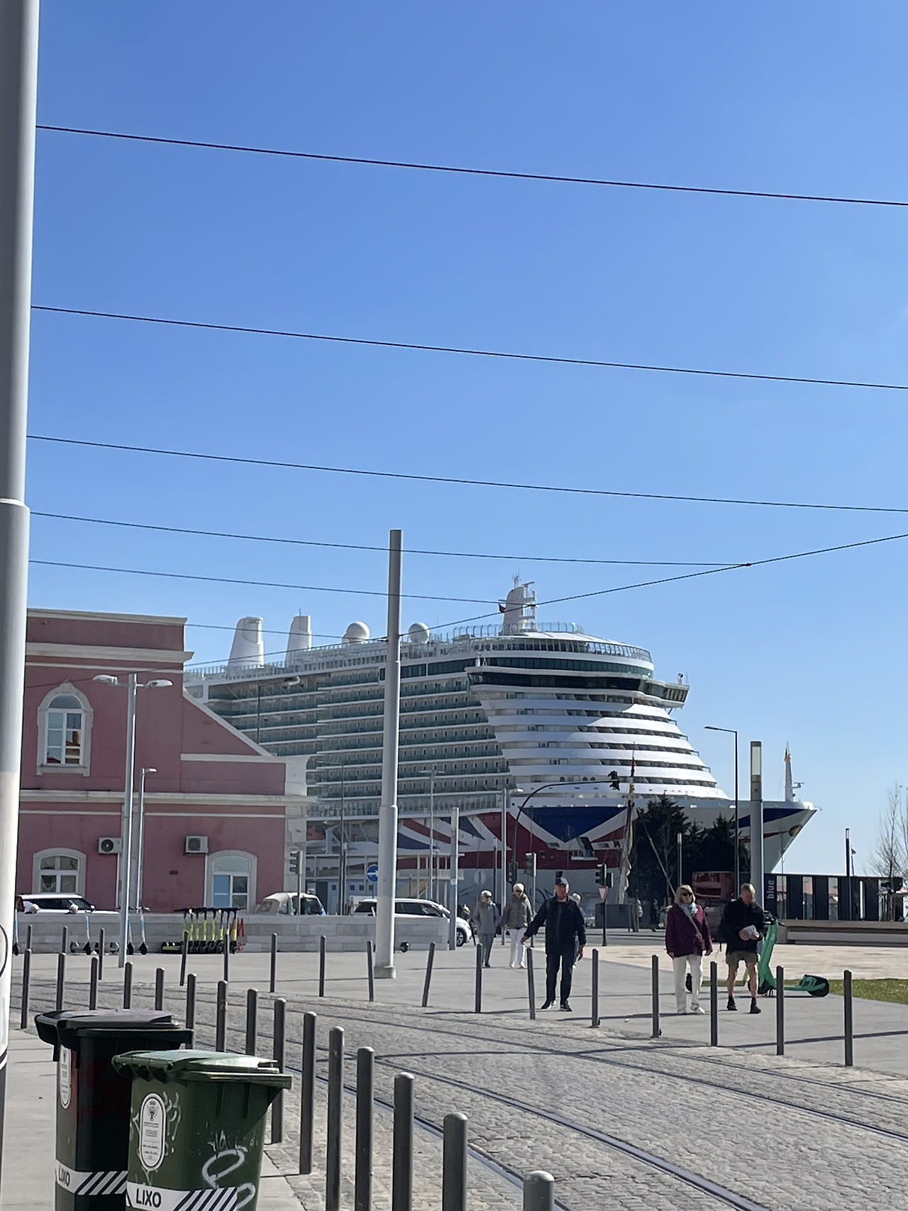 호세 사라마고 기념관 외양과 사라마고(우). 이 독특한 외관은 물고기 비늘을 상징한다는 설명을 듣는다.(좌) 기념관 옆 타구스 강변에 대형 크루즈 선박이 정박해 있다.(우)