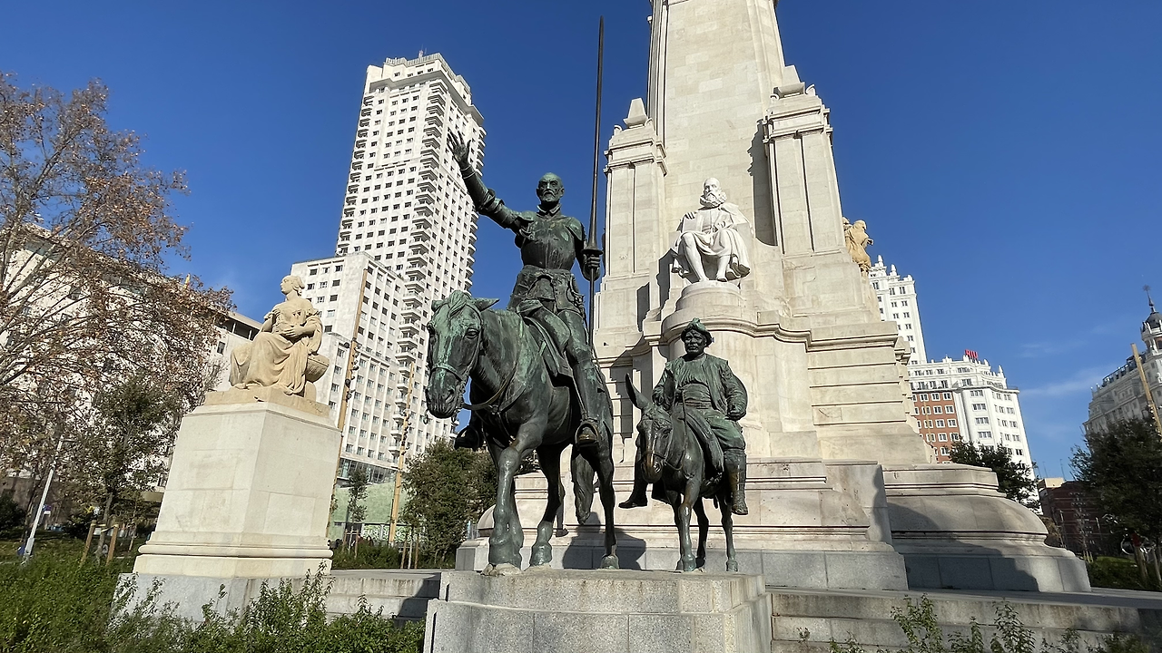 스페인 광장(세르반테스 사후 300주년 기념공원). 세르반테스가 돈키호테와 산초를 내려다보고 있다.