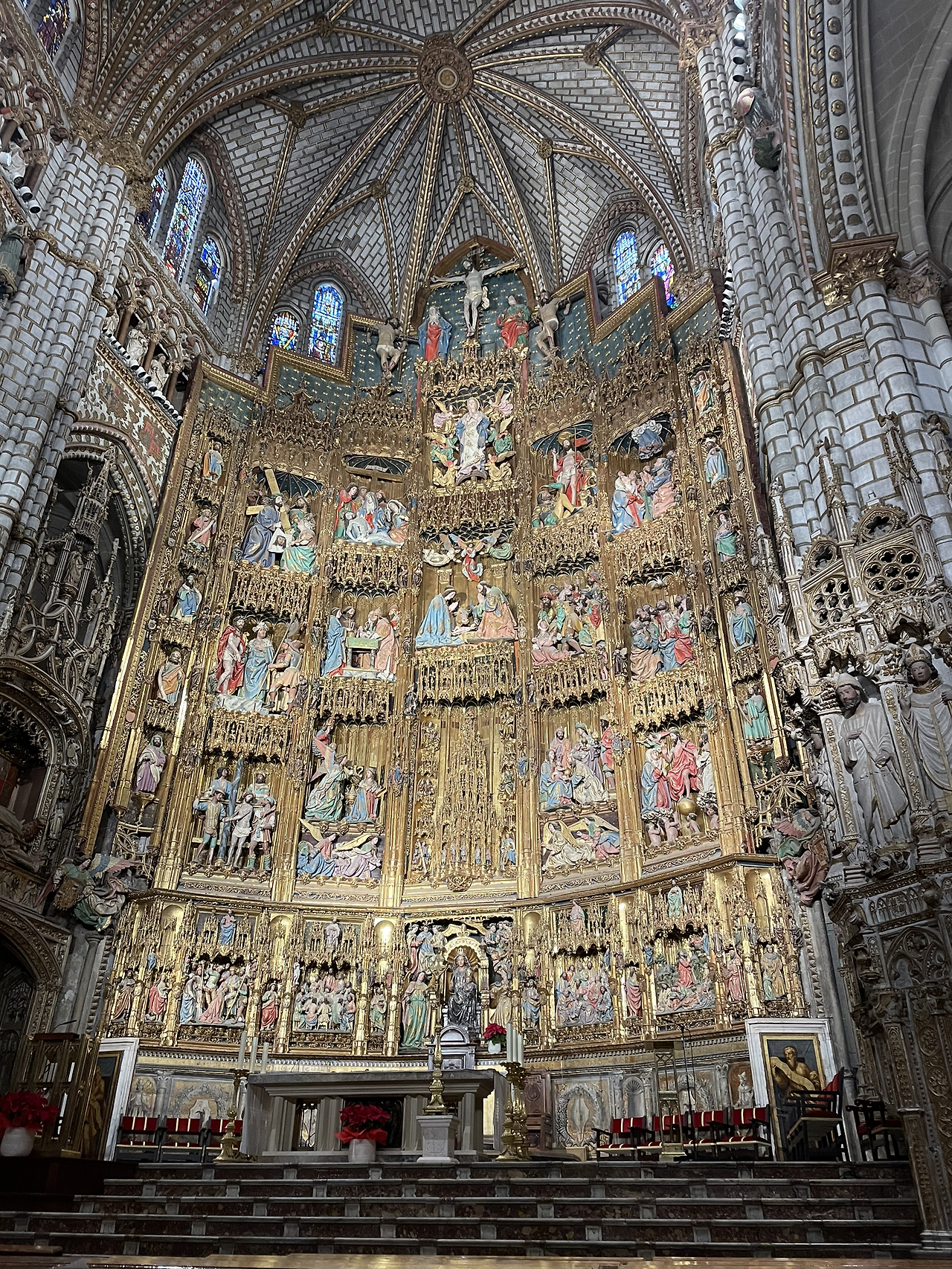 톨레도 대성당의 황금병풍. 예수님의 생애가 정교한 조각으로 표현되어 있고 조각상은 화려한 색감과 황금색으로 마무리되어 있다.