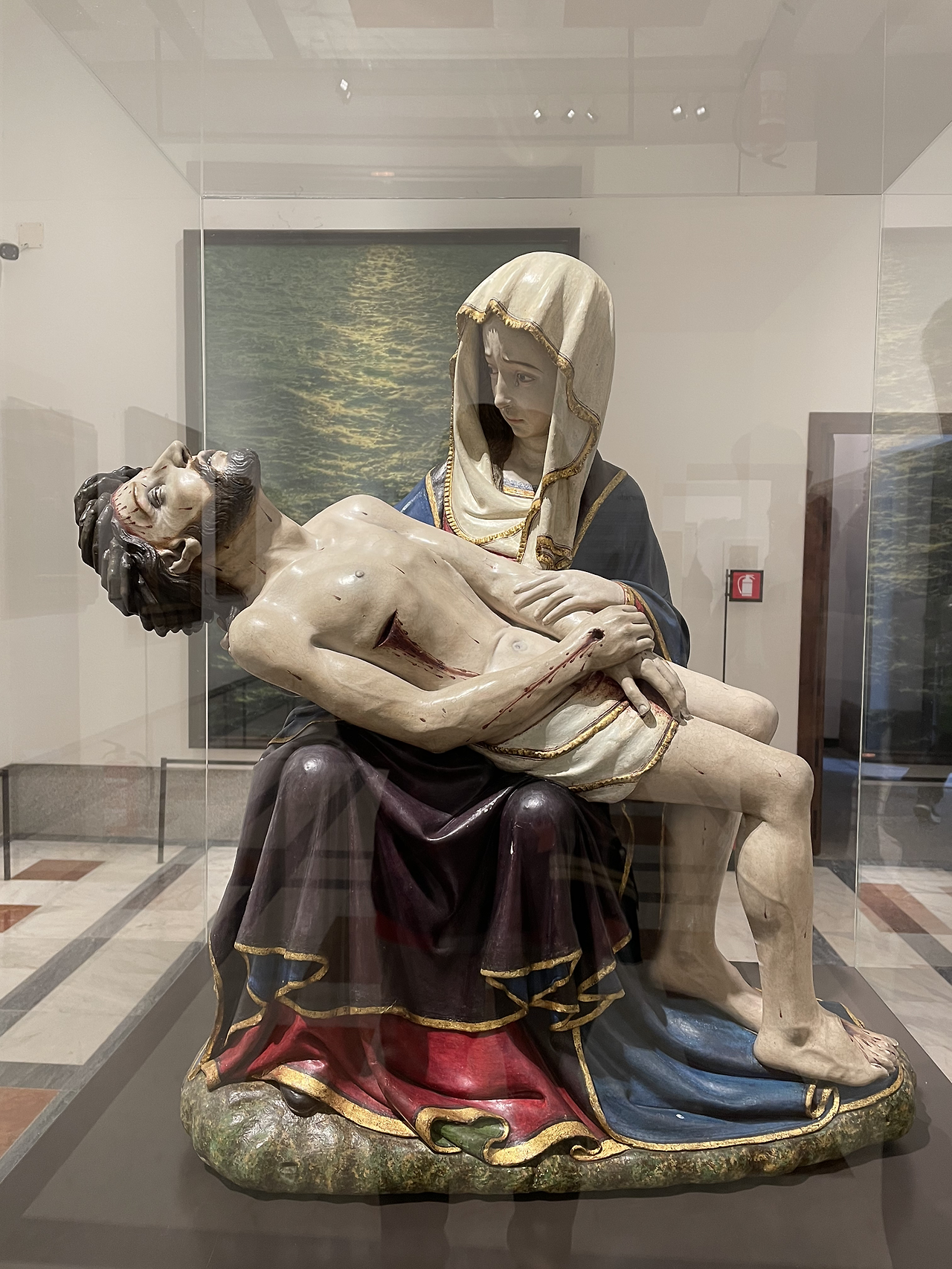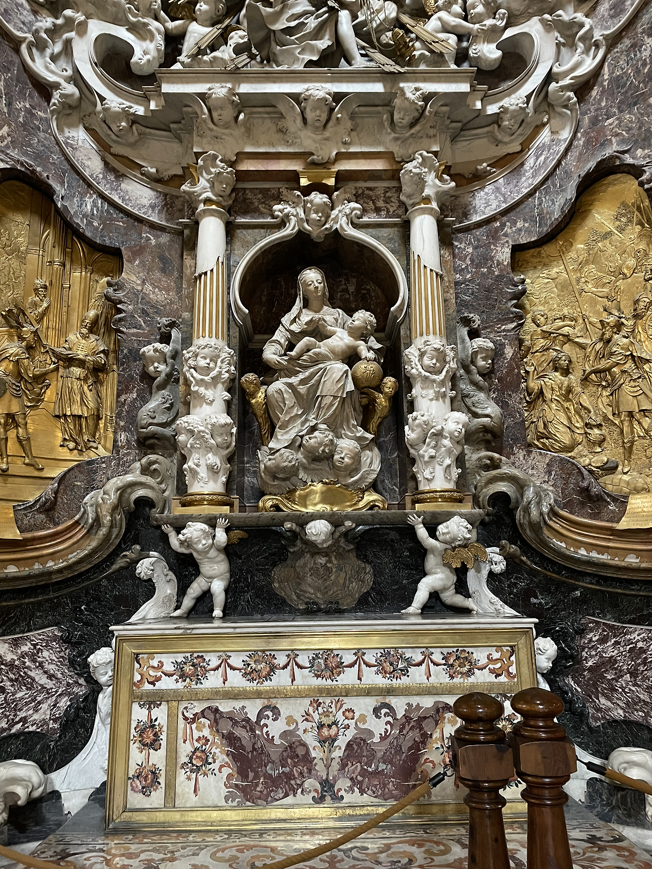지금은 오후 1시. 마리아 상이 빛을 받아 신비감을 낸다. 관광객들이 고개를 들어 사진찍기에 바쁘다. 사람들 사이를 빠져 나온 나는 벽면의 스테인드글라스를 감상하면서 보물실로 향한다. 16세기에 만든 황금 성체현시대가 사람들에게 둘러싸여 있다.