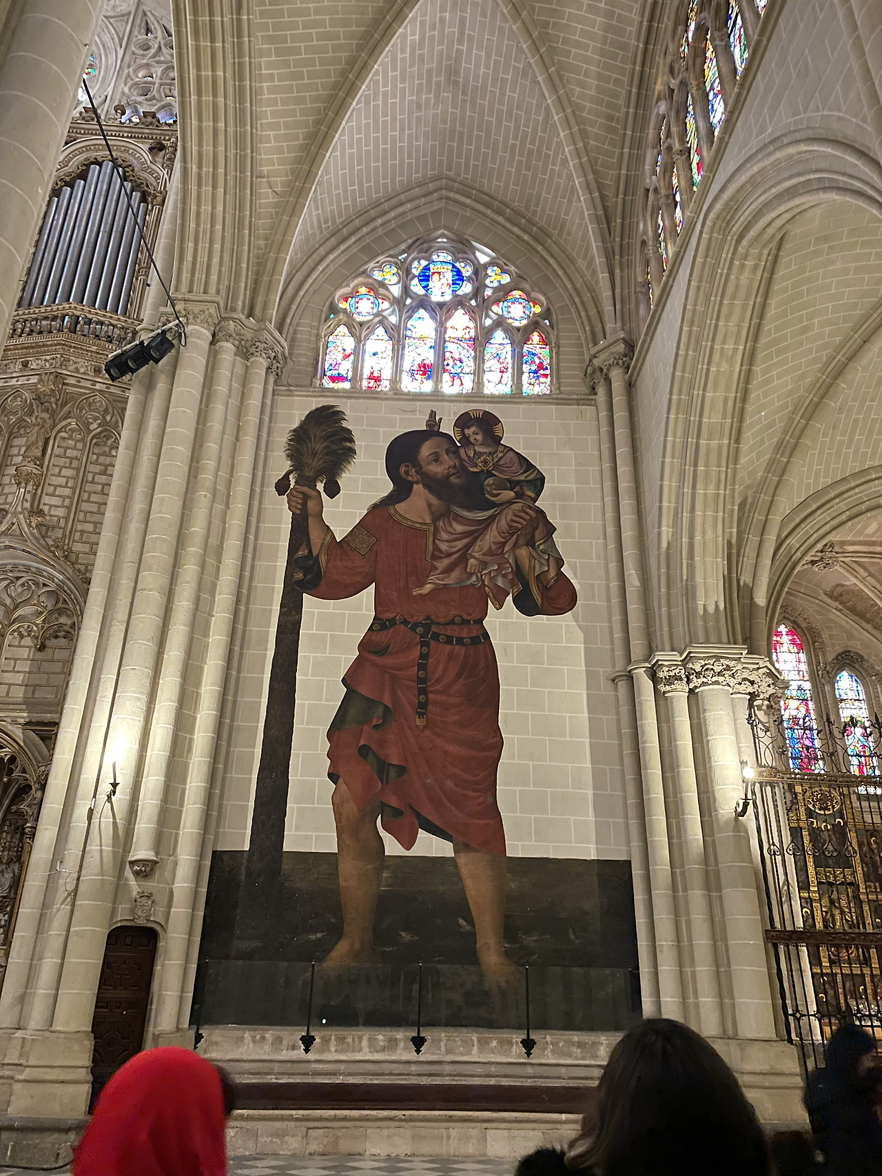 대추야자를 들고 어깨에 아기 예수를 받치고 있는 크리스토퍼 성인. 크리스토퍼는 여행자들의 수호신으로 본래 그는 강가에 앉아 사람들이 오면 강 건너 데려다주는 일을 했었다. 성경적 의미로 대추야자 이파리는 변함없는 신앙심을 뜻한다. 예루살렘에서 태어난 성격이 포악한 거인 크리스토퍼는 예수도 이길 수 있다고 장담했다. 그러던 어느 날 아이를 강 건너에 옮겨 주는데 아이의 무게가 너무 무거웠다. 그 아이가 바로 예수님인 걸 알고 그는 크게 회개한 후 수호성인 자리에까지 오른다.
