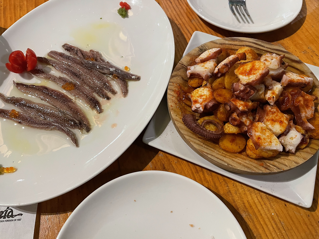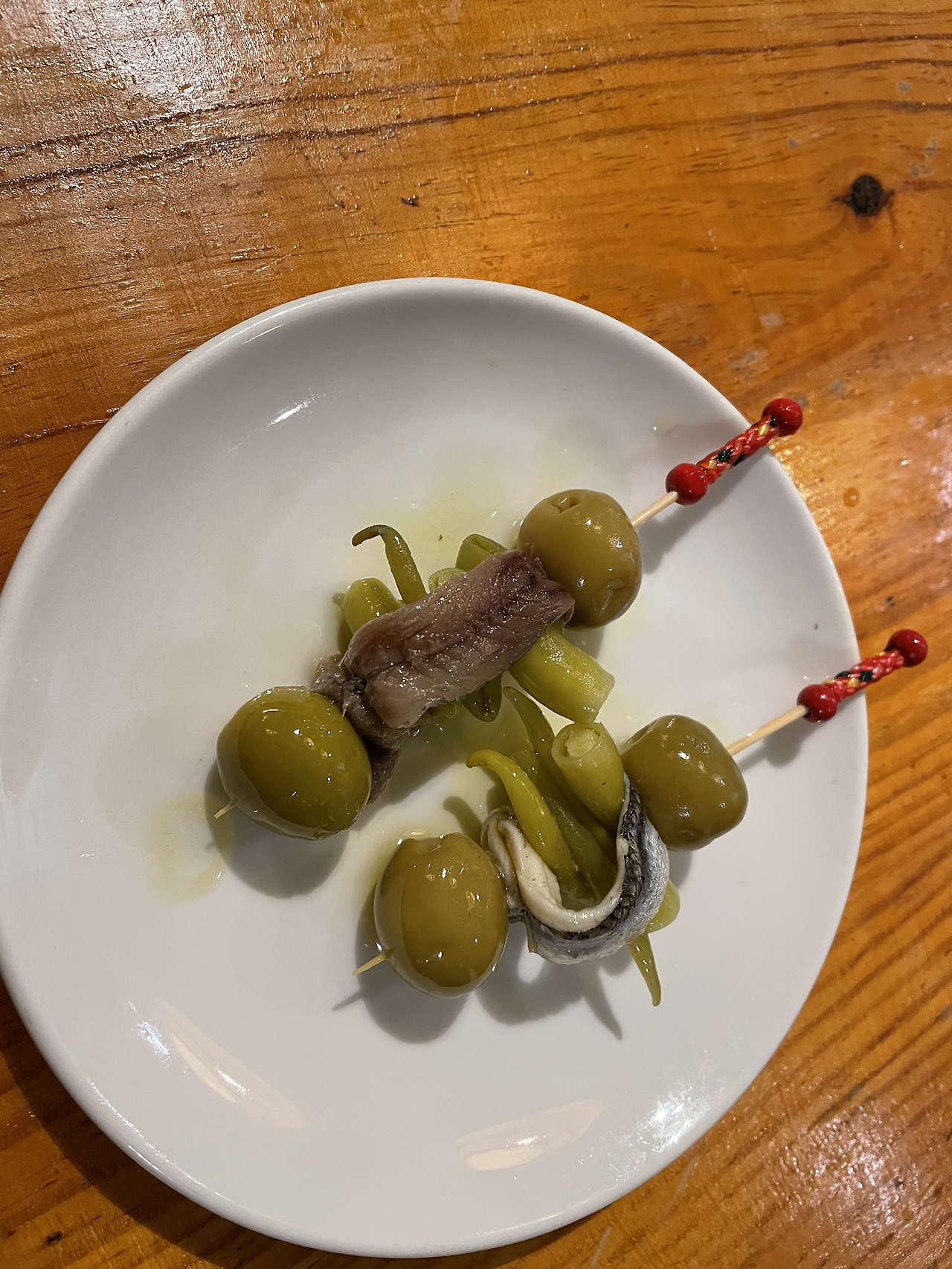 꽤 오래되어 보이는 생맥주 집과 나의 안주. 앤초비에 반해서 여러 종류의 앤초비를 주문했다.