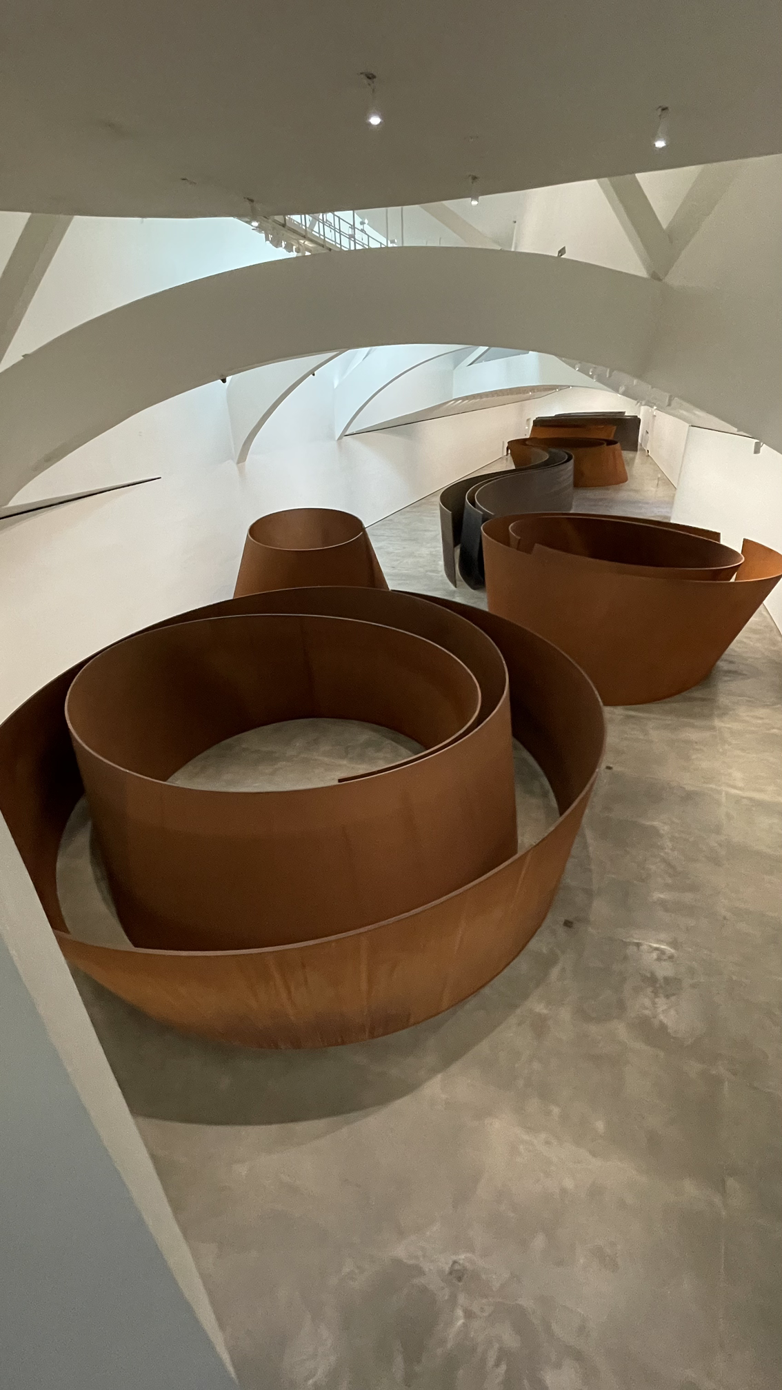구겐하임 미술관은 활력을 잃어가던 빌바오에 비타민이 된다. 미국 건축가 게리가 설계했다 하니 이웃을 만난 듯 나는 더 반갑다. 게리는 로스앤젤레스의 게티 센터를 설계한 사람으로 미주 한인들 사이에서는 잘 알려진 건축가이기 때문이다.(나는 남가주에서 10년 넘게 살았다) 기하학적 디자인의 게티 센터와 구겐하임 외양이 어쩐지 닮은 데가 있다. 엘에이 다운타운의 디즈니 아트홀 역시 프랭크 게리 설계다. 구겐하임과 디즈니 아트홀은 형과 아우처럼 같은 디자인을 하고 있다. 구겐하임 개관으로 도시는 크게 팽창한다. 미술관 외양은 삼엄 웅장, 수려하다.