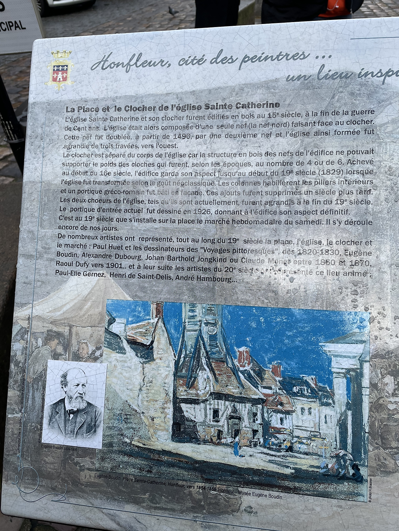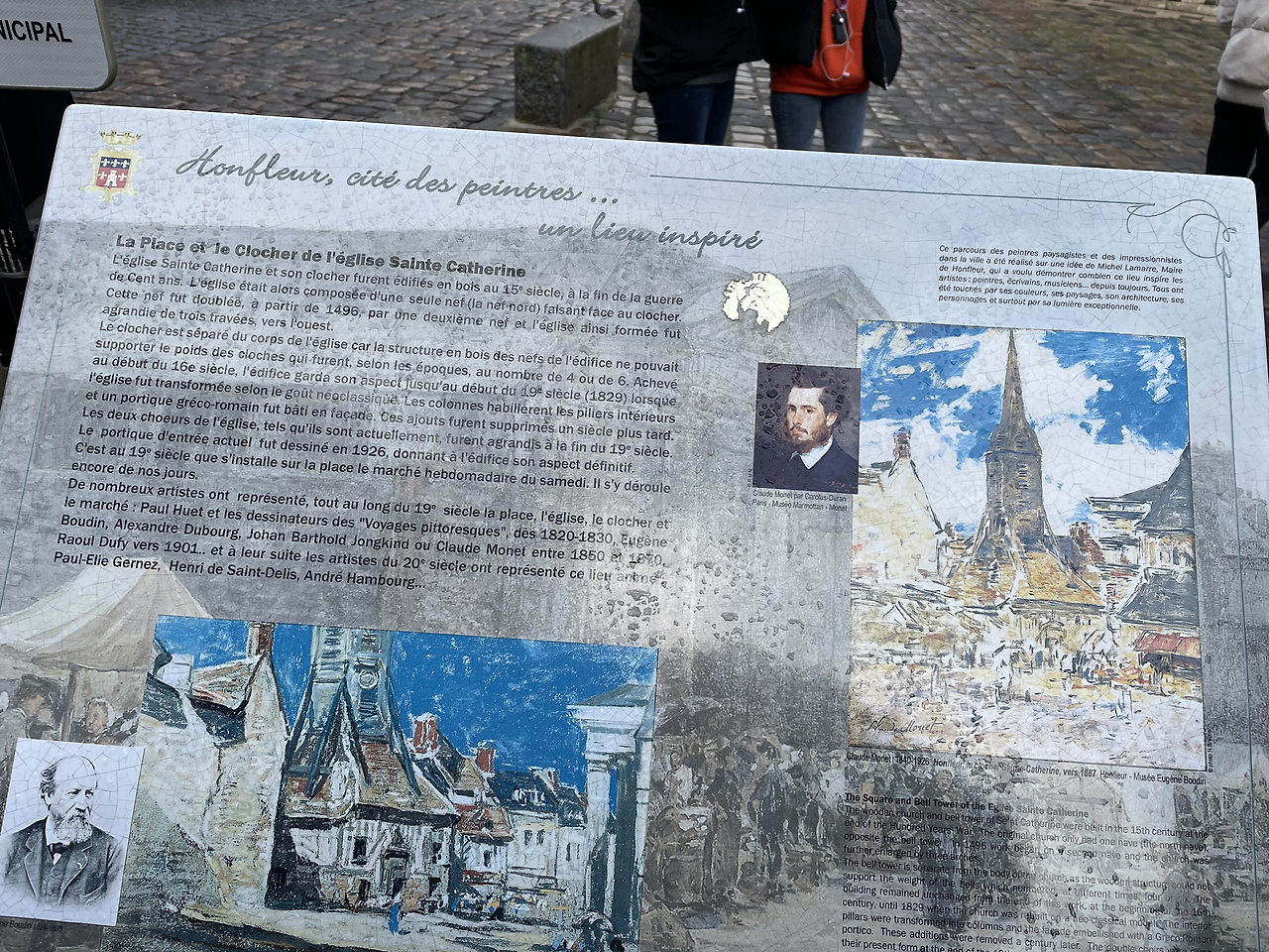 유진 보댕과 모네. 두 화가가 그린 엘리제 성당이 화풍에 따라 다른 느낌으로 표현되고 있다. 보댕의 그림은 표현주의에 가깝게, 빛이 주는 인상에 따라 그린 모네의 작품은 보다 모호한 윤곽을 보인다. 성당 앞에는 이렇게 두 거장의 미술 세계를 비교한 안내문이 그림과 함께 서 있다. 좌측이 유진 보댕, 우측 상단 사진과 그림이 모네와 그의 작품이다.
