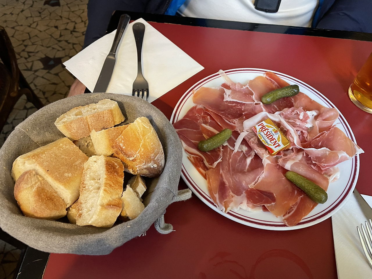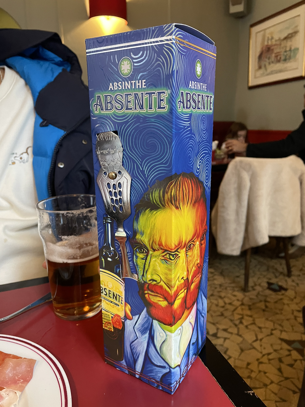 고흐로 디자인된 압생트 술병. 나는 맥주에 하몽을 안주로 시켰다.