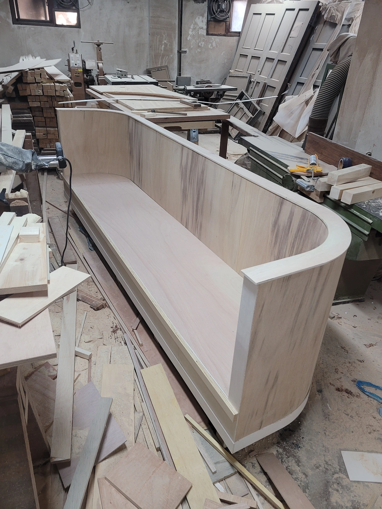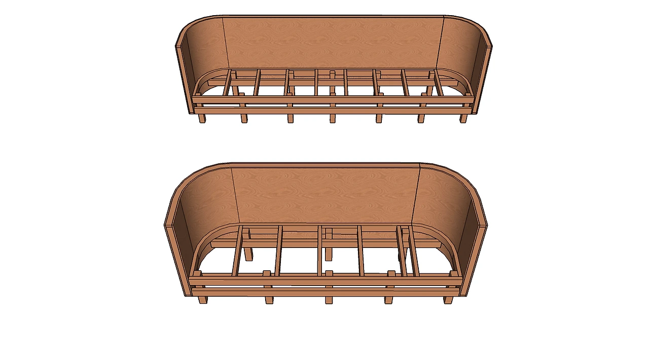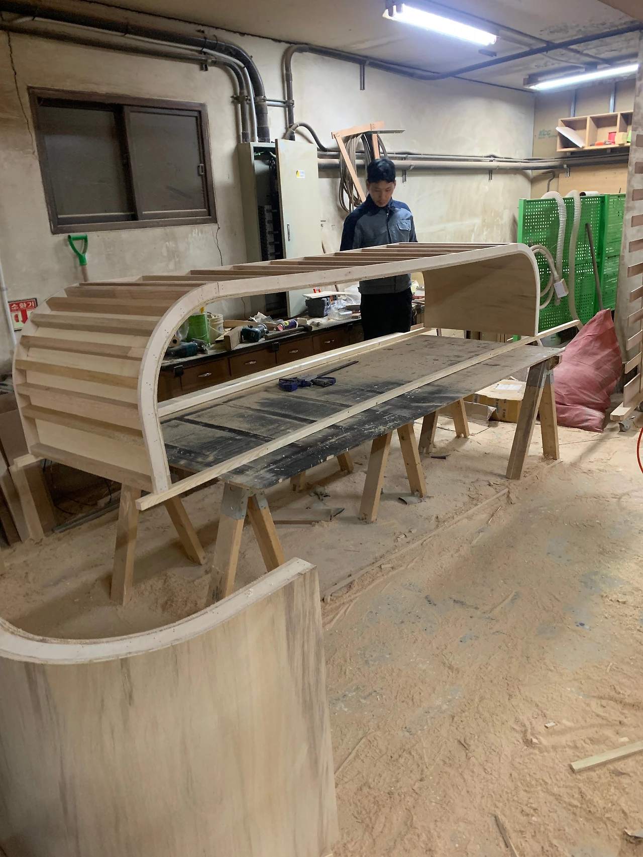 코너 골조 라운드 작업 후 등받이 오징어합판 양면 세 겹