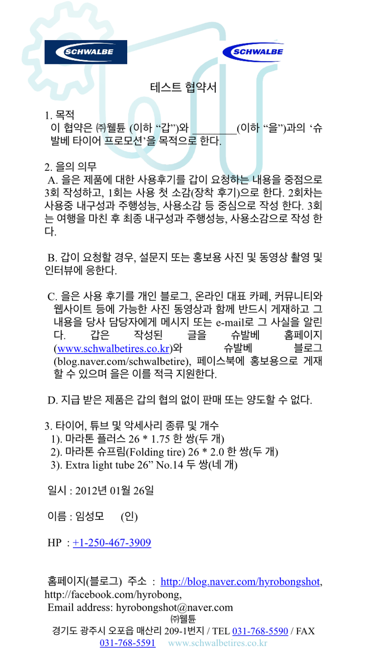 기대반 걱정반의 심정으로 협조문과 함께 슈발베 코리아에 이메일을 보냈고, 진심으로 응원한다는 답장을 받았다. 몇 차례 이메일을 주고받은 뒤 협약서를 작성했고 밴쿠버에 내려가서 자전거 타이어와 타이어 튜브 등을 메일로 받았다.