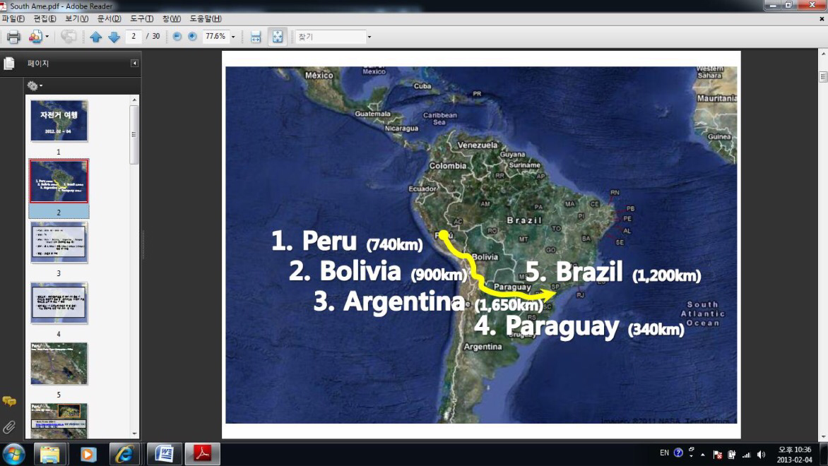 여행의 큰 목적지를 정하고(페루의 마추픽추, 볼리비아의 우유니 소금사막 그리고 브라질과 아르헨티나의 이과수 폭포), 구글맵을 보며 PPT로 여행 계획서를 만들었다. 기본적인 루트 파악과 여행 중 국경이나 볼리비아에서의 비자 문제를 쉽게 해결하기 위함이었다. 커닝 페이퍼를 만드는 기분이었다.