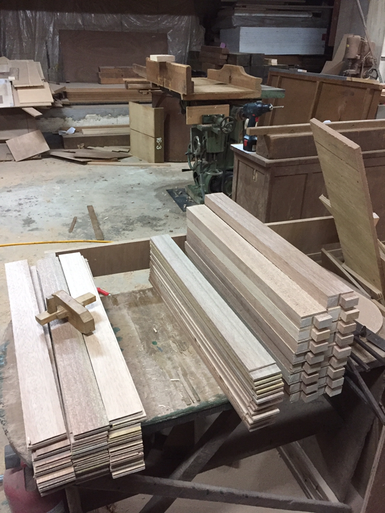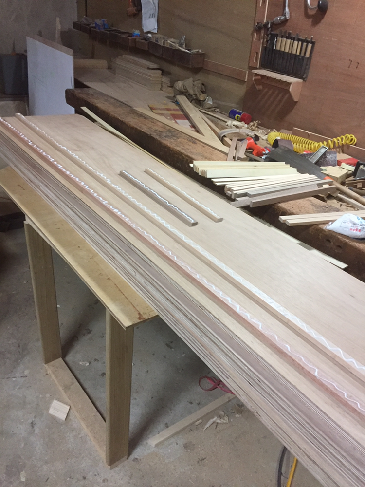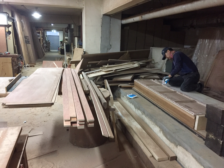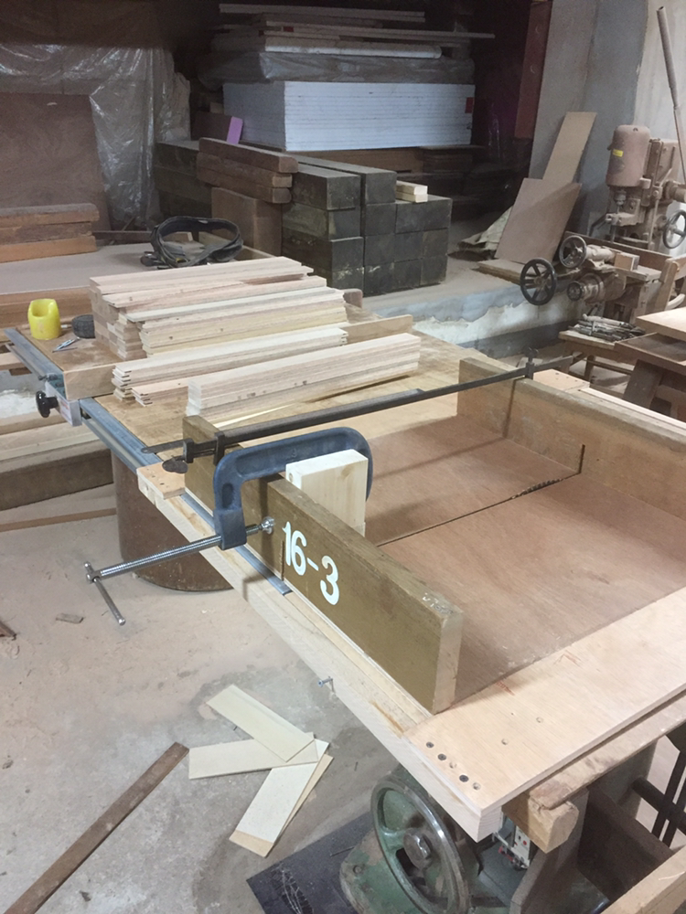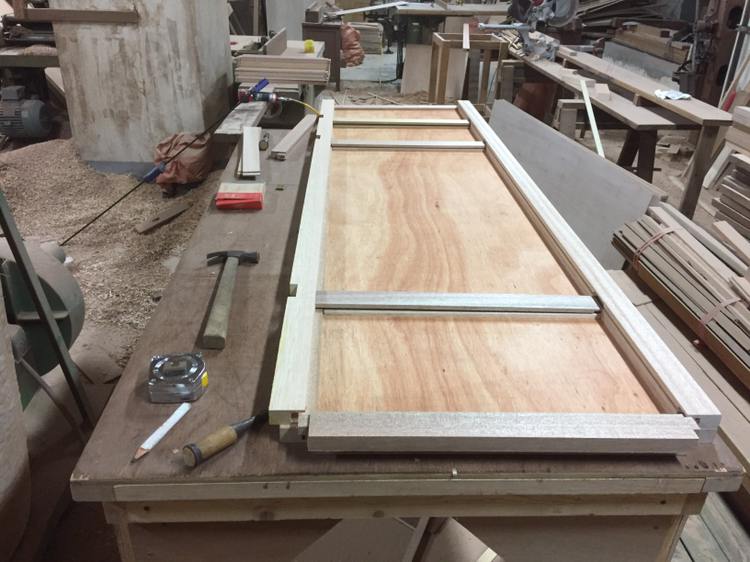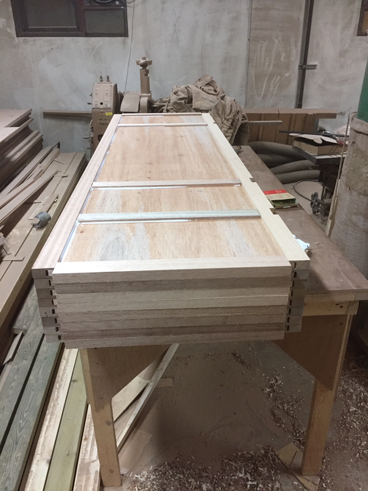 문 양면합판 양생 후 면 정리를 한다. 수압대패 테이블쏘우 등을 이용해 직각을 맞춘 후 후지를 본드로 붙이고 다시 양생한다.