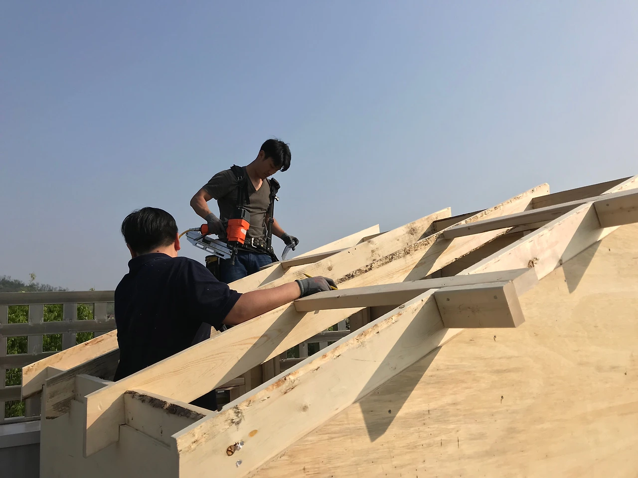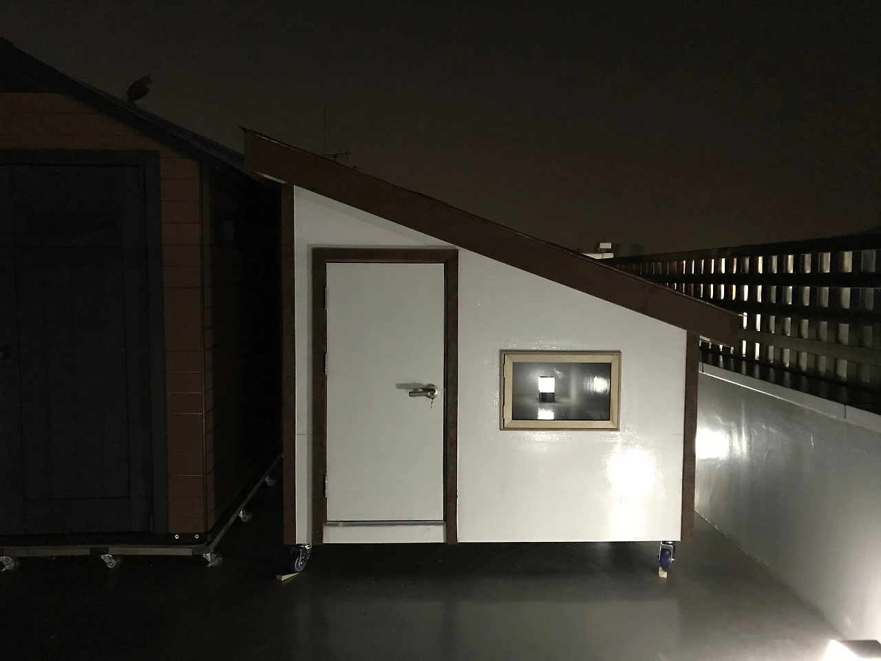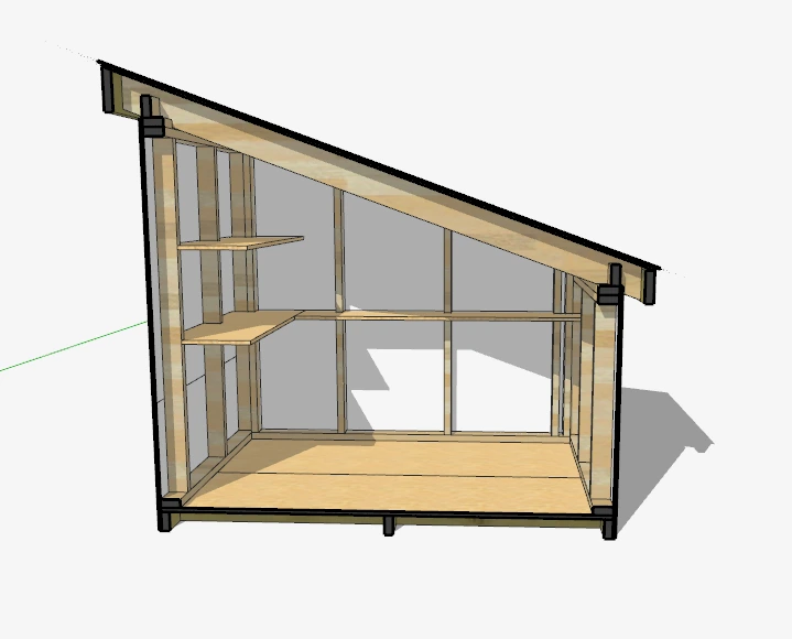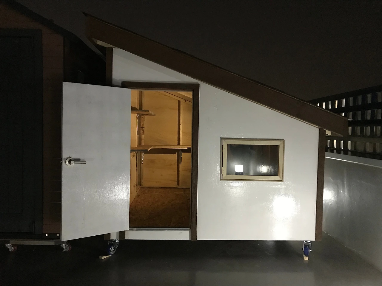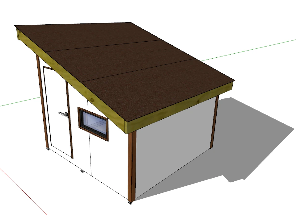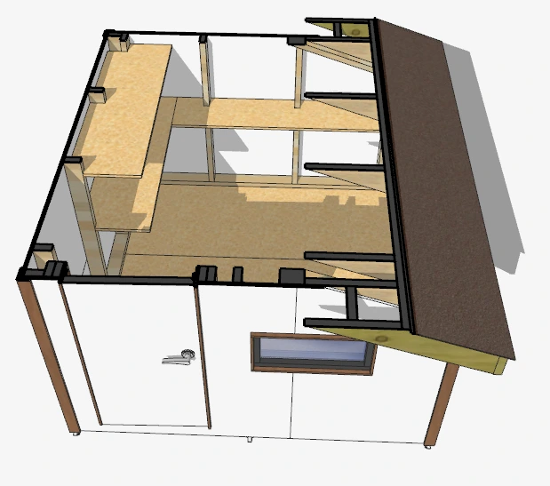 하부 바퀴, 경량목구조, 쉐드지붕 20도 롤슁글, 외부 방수합판, 백색 에나멜, 몰딩 및 페이샤 오일스테인 마감