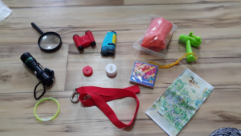민박에 돌아와 시장에서 사 온 삶은 옥수수, 닭강정 등으로 끼니를 때우고 젖은 옷을 말렸다. 그때 아이는 가방을 열어 자신의 보물 같은 짐을 풀어놓는다. 돋보기, 휴대용 현미경, 망원경, 줄자, 비옷, 미니 촛불, 플래시, 야광팔찌, 색종이까지 다양하게도 가방에 넣어 하루 종일 메고 다녔다. 이렇게 준비성이 철저했나? 감탄하며 사진을 하나 남겨놓았다.