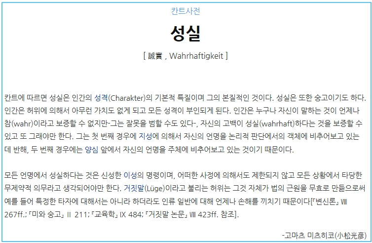 그 성실이라는 뜻에는 내가 정의한 나의 모든 것이 다 들어있는 것 같다. 성실의 한자 표현은 誠實(정성 성, 열매 실)이다. 사전 풀이는 정성스럽고 참됨. 일본의 칸트 연구자들 158명이 집필하여 2009년 출간된 <칸트 사전>에 성실이라는 개념이 정의되어 있다. 내가 찾아본 성실이라는 의미 중 이제껏 내가 생각하고 살아온 이상적 성실에 가장 가까운 것 같다.