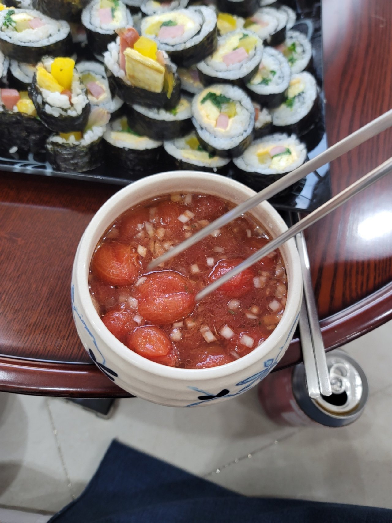 그날 우리 집에서 함께 한 손님은 모두 여성이었다. 그녀들은 방울토마토 마리네이드를 처음 보았다고 했다. Y가 제일 먼저 내가 만든 집 김밥에 방울토마토 마리네이드를 얹어서 먹기 시작했다. 의외였지만 함께 먹으면 궁합이 더 좋아지는 음식이었나 보다. 엄청 맛있다며 나에게 찬사를 보냈다. 다른 손님들도 그 얘기를 듣더니 우르르 유행처럼 김밥에 방울토마토 마리네이드를 얹어 먹었다. 동서양의 만남은 이럴 때 쓰는 말이기도 할까.