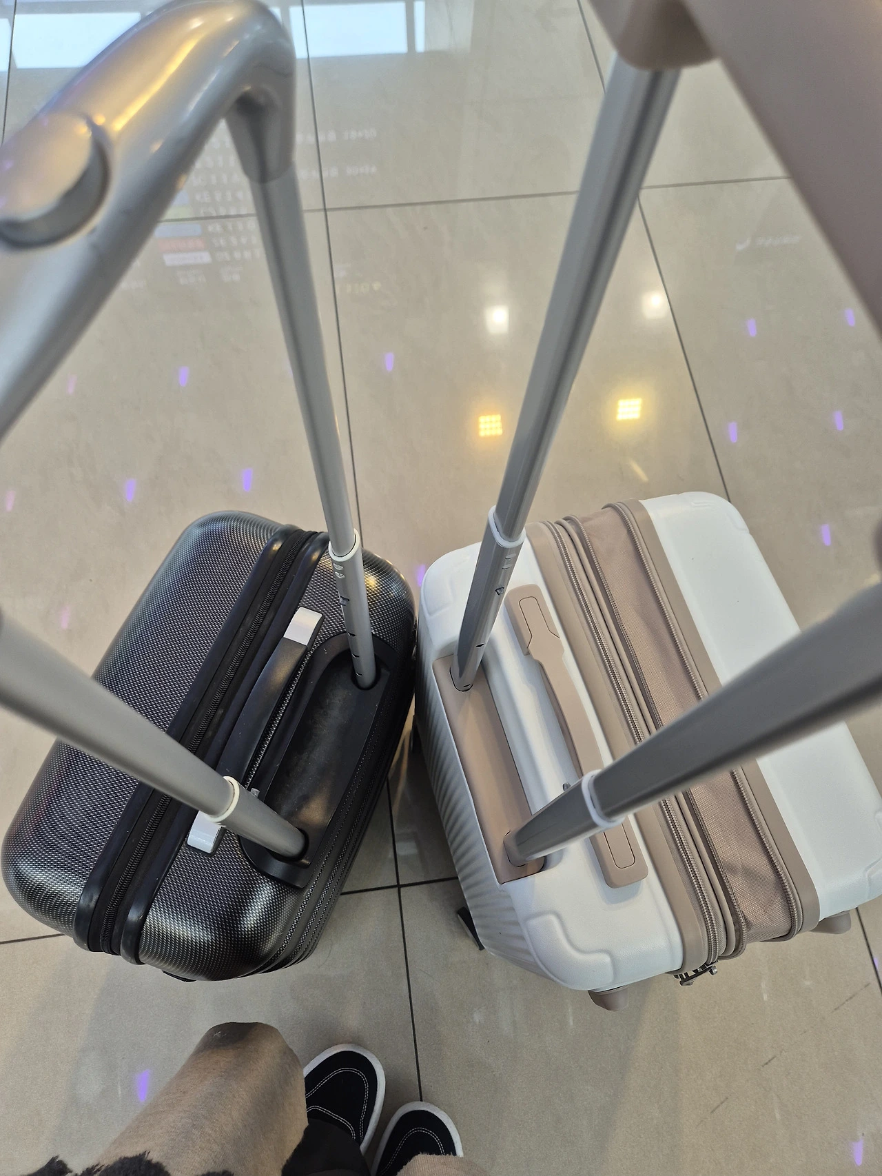 두 개의 캐리어 손잡이를 잡고 서 있었다.