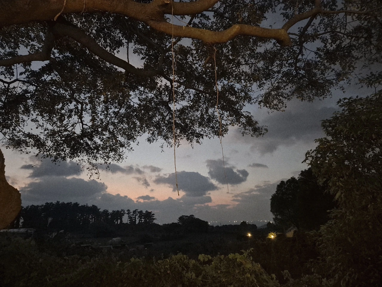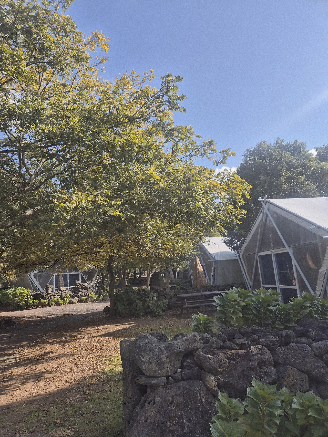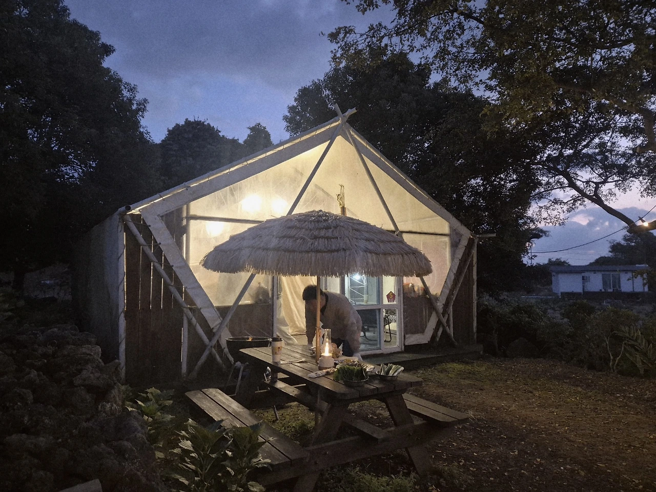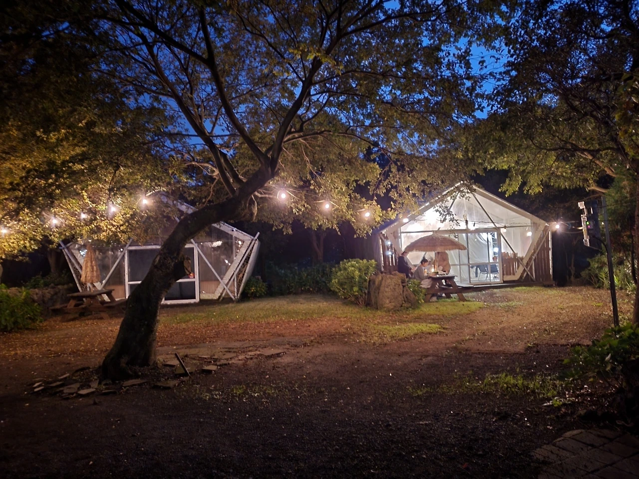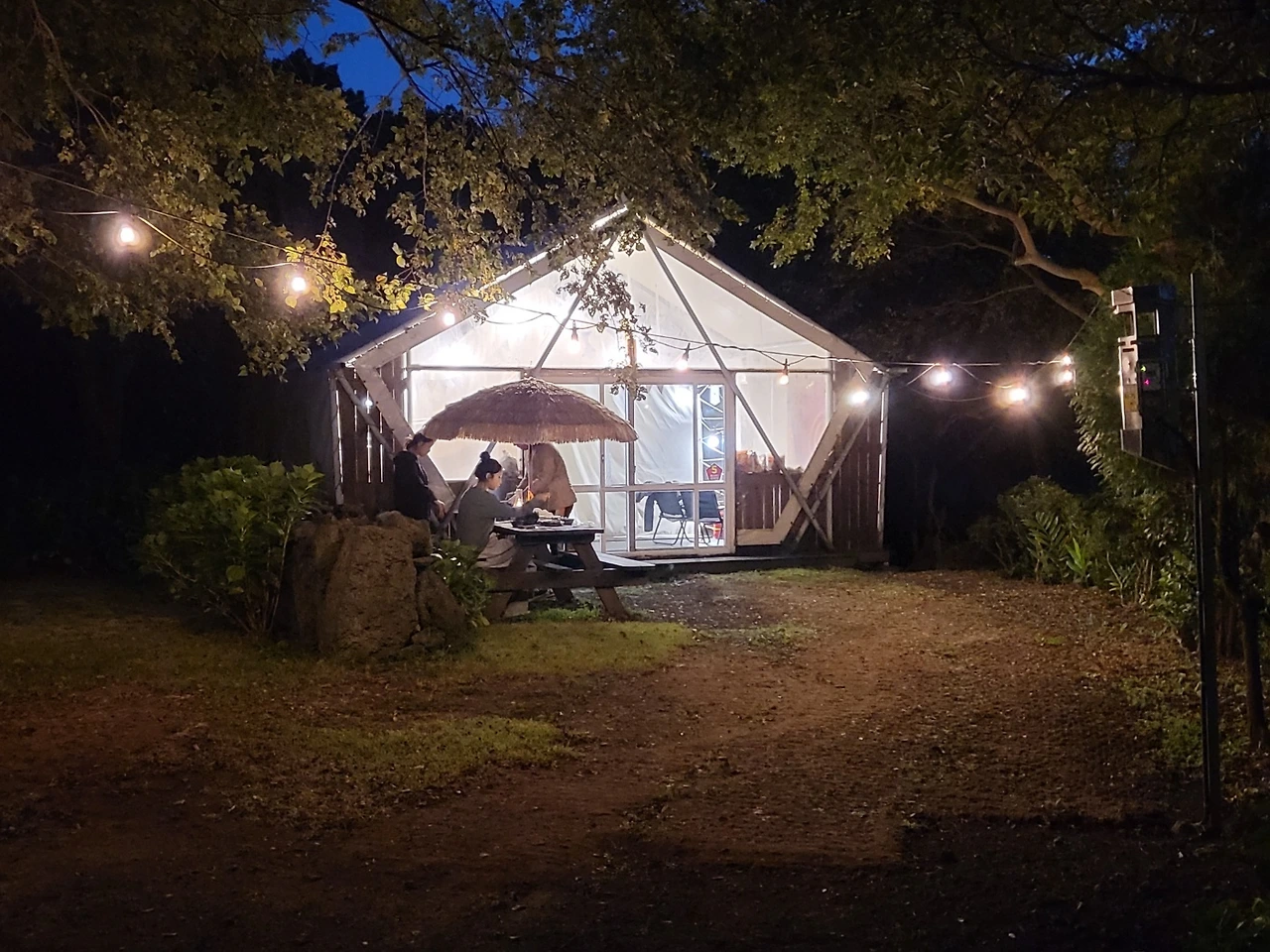 글램핑 텐트 밖으로 나무들이 흔들리고,