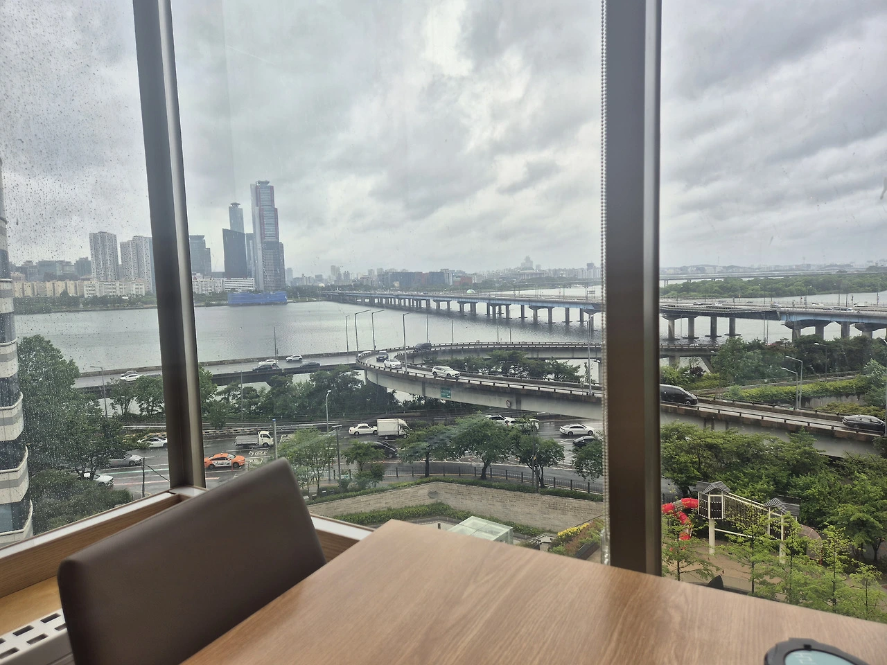 비에 젖은 유리창 너머로 한강이 흐르고,