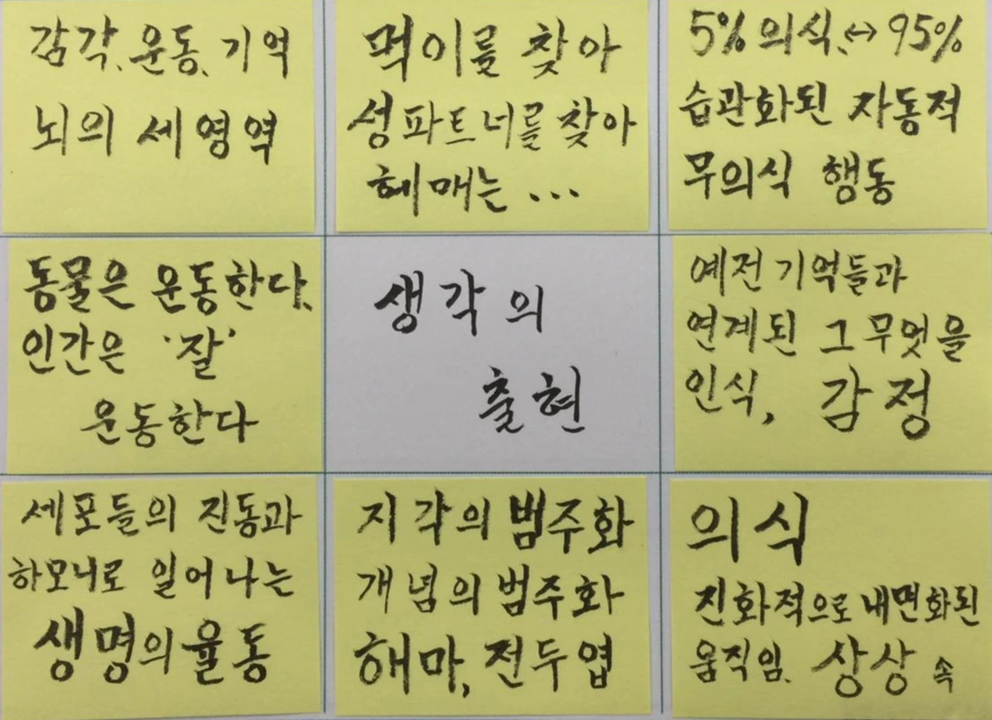 생각의 출현은 자체가 의문투성이이다. 세포들의 진동과 하모니로 일어나는 생명의 율동이라는 표현은 전율을 일으킨다. 그것은 나만의 율동이 아니라 동조되는 이 세상의 율동일 것이므로..