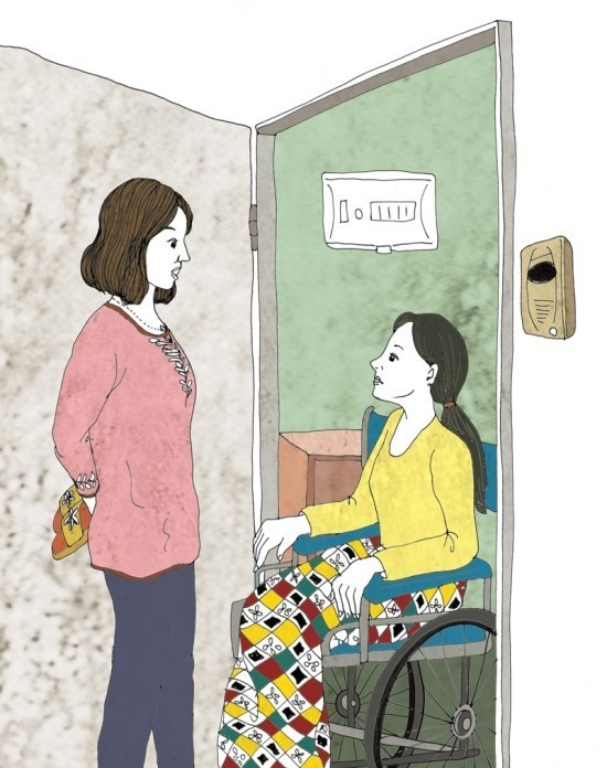 결국 '나'는 묘안을 찾던 중 지난 겨울에 선물 받은 실내 용 슬리퍼를 생각하고 이 것을 선물하면서 조용히 하라는 메시지도 함께 부드럽게 전달하기 위해 위 층을 찾아가나 윗 집 여자가 휠체어를 탄 젊은 여자였다. 그녀가 소음이 적은 바퀴로 갈아 볼 참이었다며 죄송하다고 말하자 '나' 선물하려고 했던 슬리퍼를 황급히 뒤로 감추며 정작 이웃에 무관심 했던 자신을 부끄러워한다.